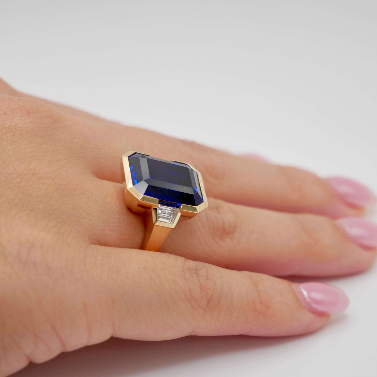 This exquisite 12 Ct Lab Grown Emerald Cut Sapphire and Trapezoid Diamond Ring is masterfully set in 18K yellow gold. This piece captures the essence of modern elegance with its sharp, clean lines and a striking bezel setting. Flanked by trapezoid diamonds, the sapphire centerpiece exudes a royal blue hue. Perfect for those who cherish contemporary design with a hint of classic allure.