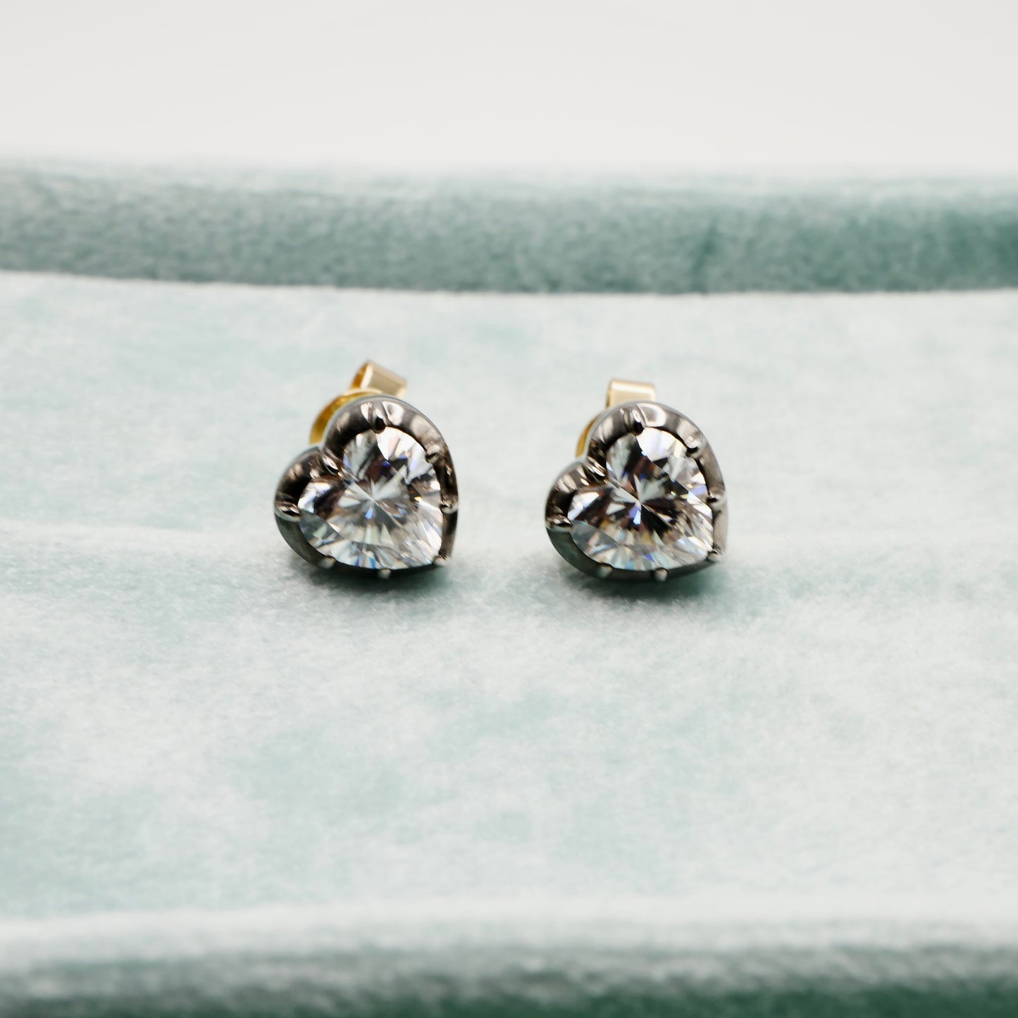 A pair of beautiful heart cut stud earrings, set with 3 carats (1.5 carat each) of brilliant cut moissanites in Georgian cut down setting, handcrafted in 18k blackened and 18k yellow gold.
