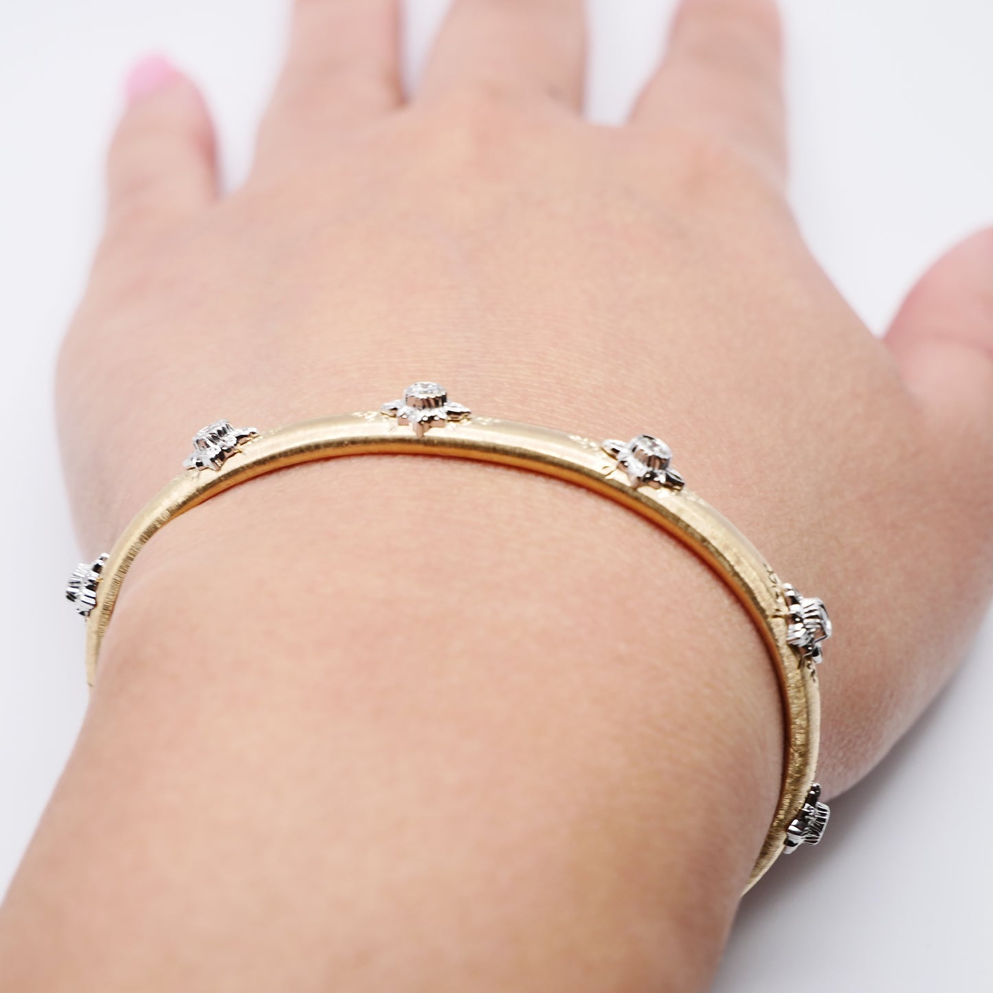 Indulge in the luxurious allure of our 18k Engraved Gold Silk-Inspired Bangle, a masterpiece of craftsmanship and elegance. With a width of 5 mm, this bracelet captivates with intricate engravings that artfully mimic the soft folds of silk fabric, adding a touch of timeless sophistication to your ensemble. Adorned with delicate diamond flower inlays, each petal sparkles with brilliance, creating a harmonious blend of opulence and nature-inspired beauty. White gold studs accentuate the design, contributing a contemporary edge to this exquisite piece. Total carat weight is 0.5 cts.
