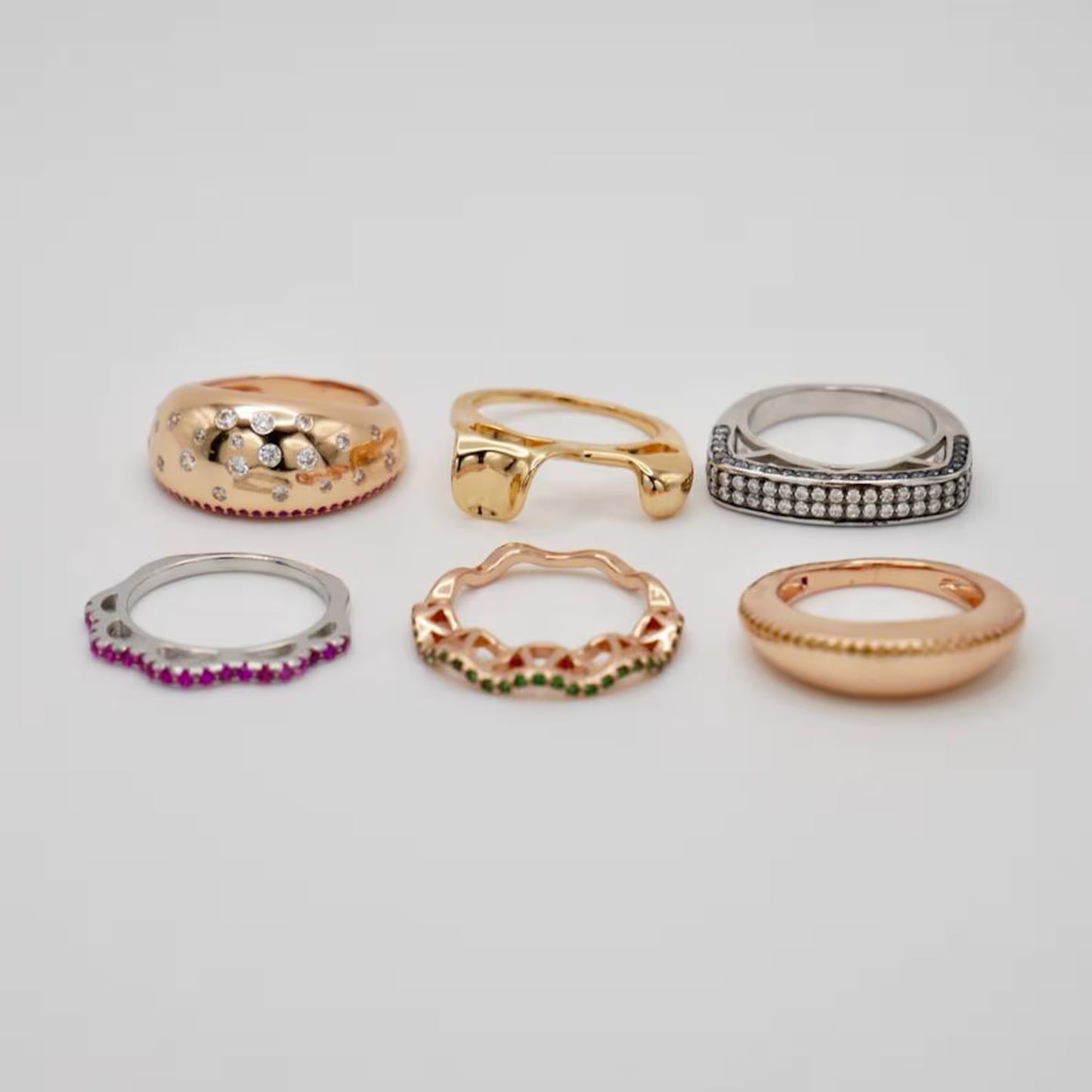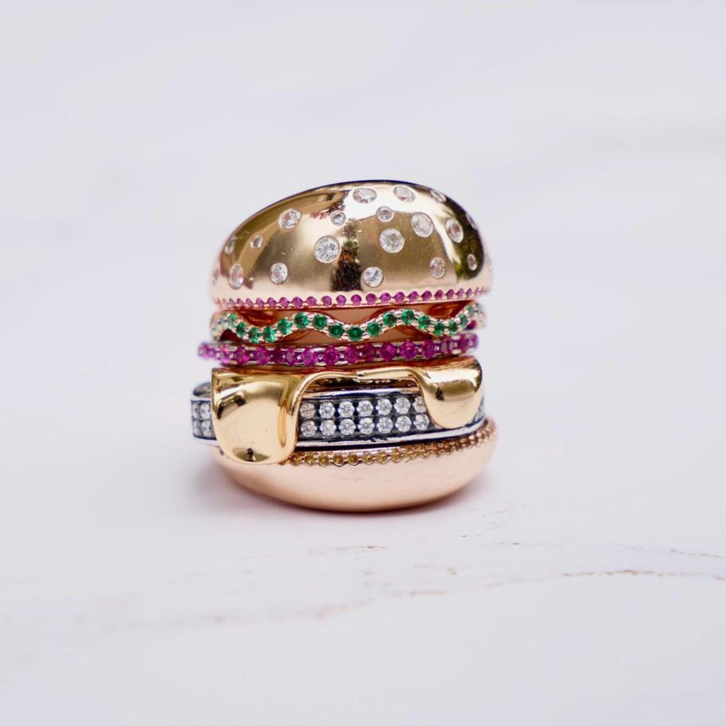 • The 18K gold-filled stackable hamburger ring, featuring six whimsical layers — buns, lettuce, tomato, cheese and patty — designed to be worn together or mixed and matched