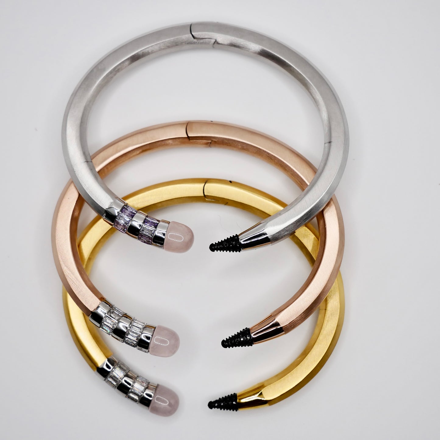 This charming pencil bracelet is a delightful tribute to creativity. The clever design features sparkling white or rainbow baguette moissanites and contrasting black moissanites that beautifully recreate the classic pencil look, topped with a genuine pink nephrite stone that adds a pop of color. Crafted in premium gold-filled metal, this piece is completely waterproof and tarnish-resistant, ensuring years of worry-free wear. The hinged bracelet opens smoothly for easy wear, combining the luxurious warmth of gold-filled metal with the brilliant sparkle of premium moissanites. Whether you're treating yourself or searching for an unforgettable gift, this whimsical piece celebrates the power of words and creativity in the most stylish way. It's guaranteed to spark conversations and bring a smile to anyone who appreciates the perfect blend of playfulness and elegance. Nadine Ghosn Pencil Bracelet Bangle