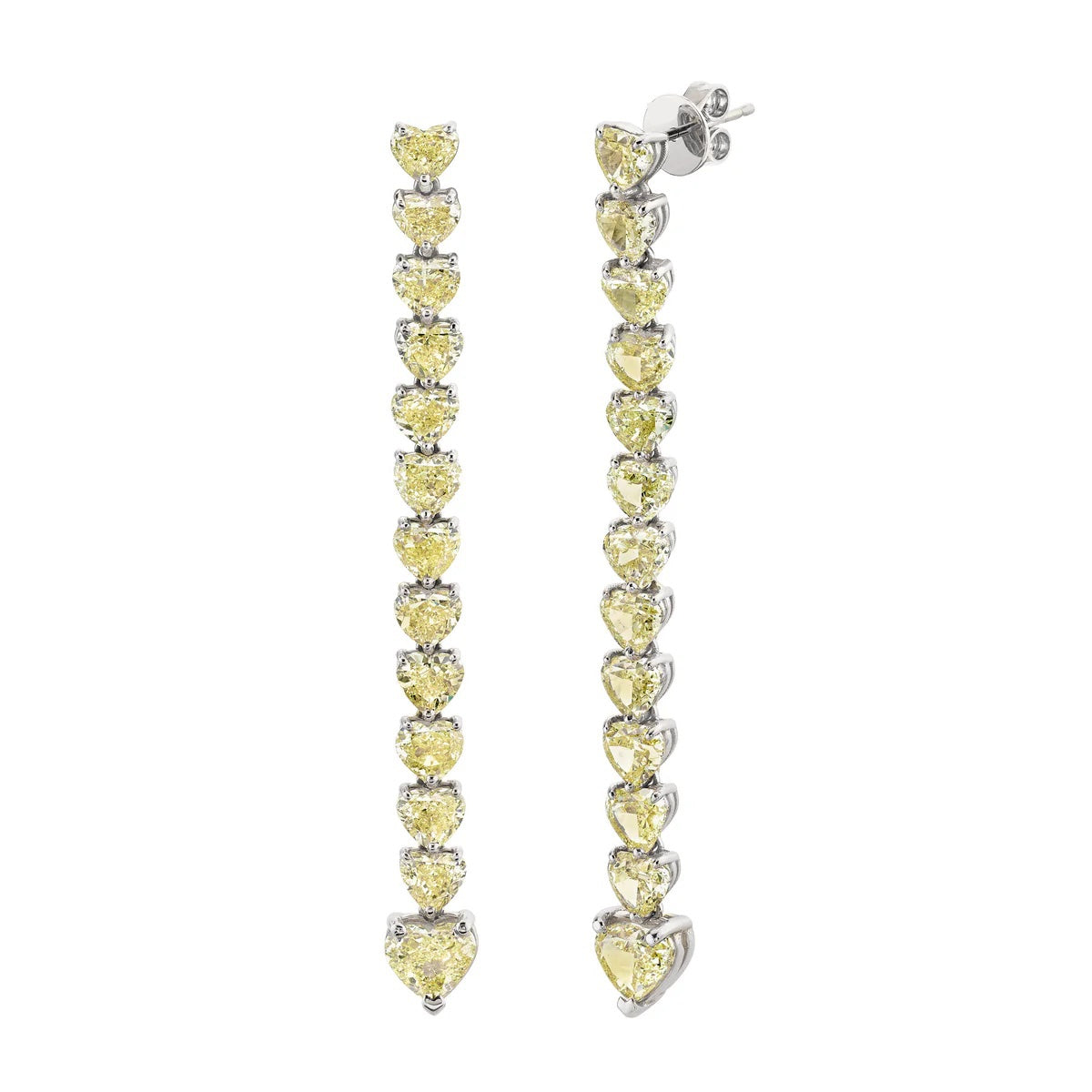 Our 18K Gold Heart-Shaped Fancy Yellow Diamond Earrings. Each earring intricately features 13 heart-cut lab-grown fancy yellow diamonds, summing up to a dazzling 26 diamonds across the pair with a total weight of 6 carats. Extended to a graceful 6 cm in length, these earrings available in your choice of 18K yellow, rose, white, or blackened gold. Opt for the brilliant sparkle of lab diamonds or the impeccable clarity of moissanites to make these earrings uniquely yours.