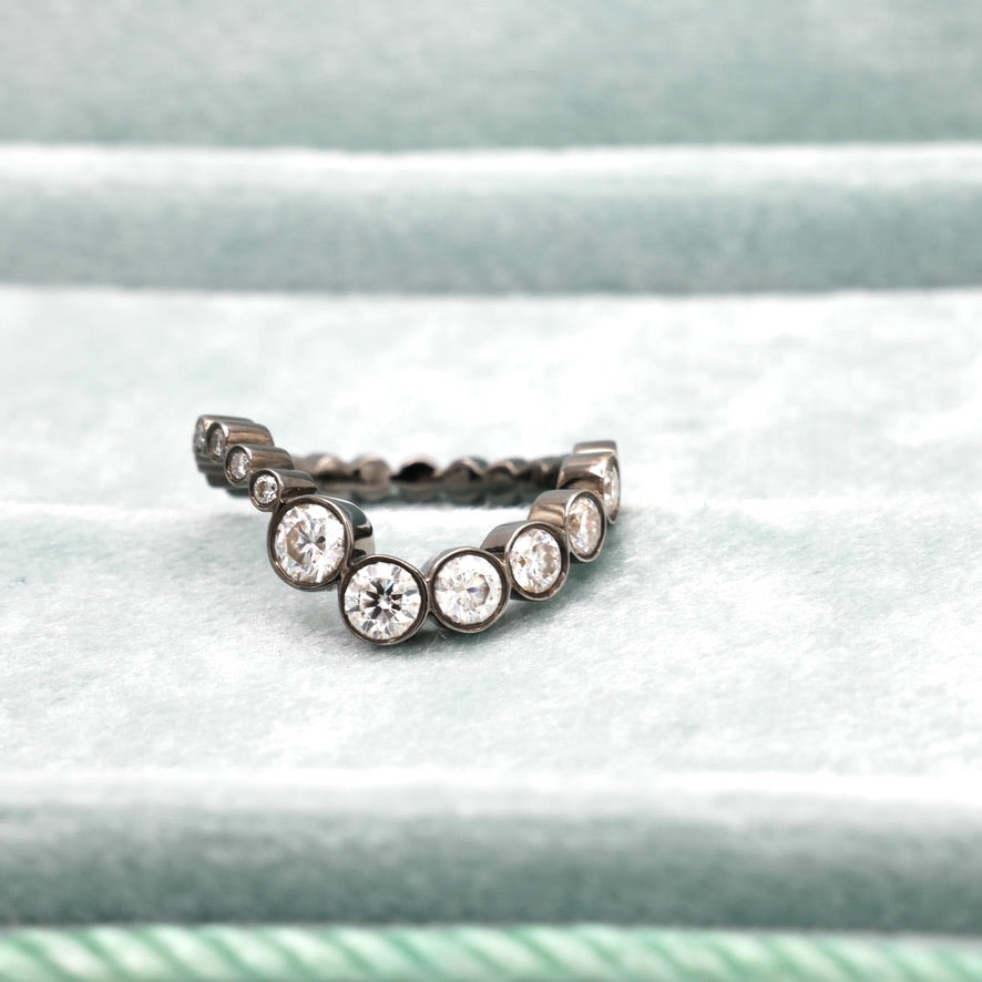This exquisite ring elegantly mirrors the rhythmic dance of waves, with its intricate design and shimmering gemstones capturing the essence of the sea's allure. This ring features a row of lab diamonds or moissanites that curve around the finger. Total carat weight of 1.4 cts. Sophie Bille Brahe Ensemble Diamond Ring