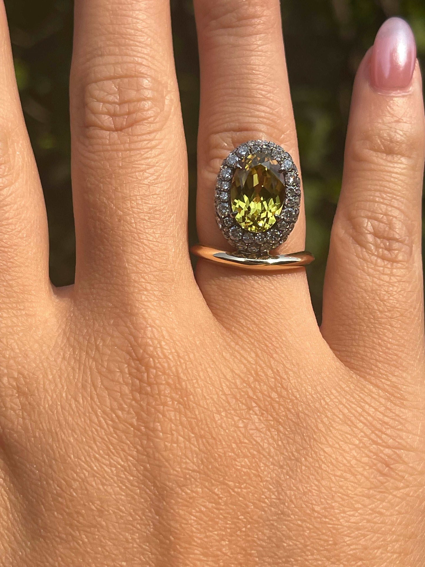 Introducing our dazzling Oval Emerald Donut Ring! This beauty features a vibrant 3 carat lab grown oval yellow sapphire, hugged by a halo of pave moissanites in a blackened setting, creating a delightful donut effect. Set atop an 18K yellow gold band, it's a playful twist on classic elegance. Flaunt your unique style with this eye-catching ring that's sure to turn heads! Arielle Ratner Sapphire Pave Perch Ring