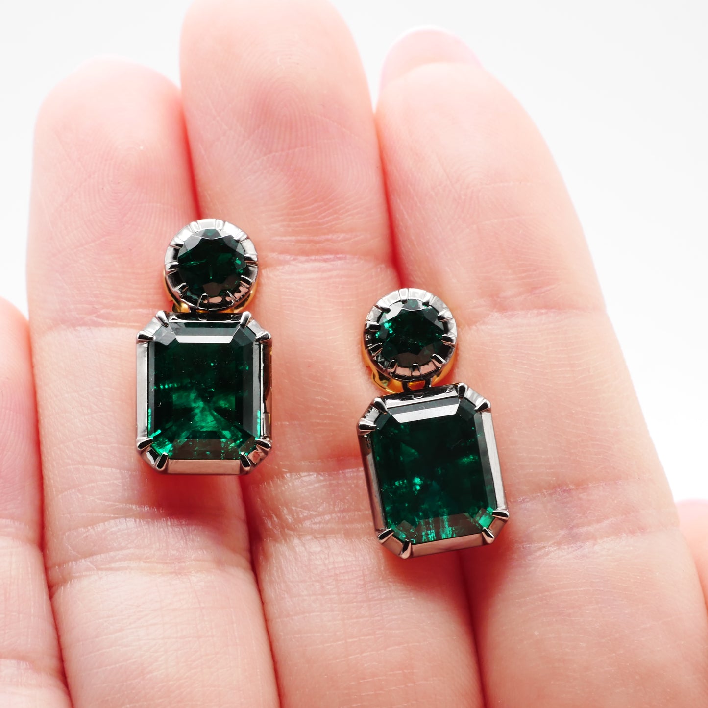 These two-stone lab grown emerald earrings is meticulously crafted with 9 carats of lab-grown emeralds in a striking combination of blackened and yellow gold. Each earring features at round emerald and an emerald-cut emerald, with the inclusions creating a one-of-a-kind garden of depth that dances with every movement. The georgian collet settings in blackened gold and the warm yellow backs provide a luxurious contrast that elevates these studs beyond ordinary fine jewelry. These statement pieces transform from day to evening with effortless sophistication.