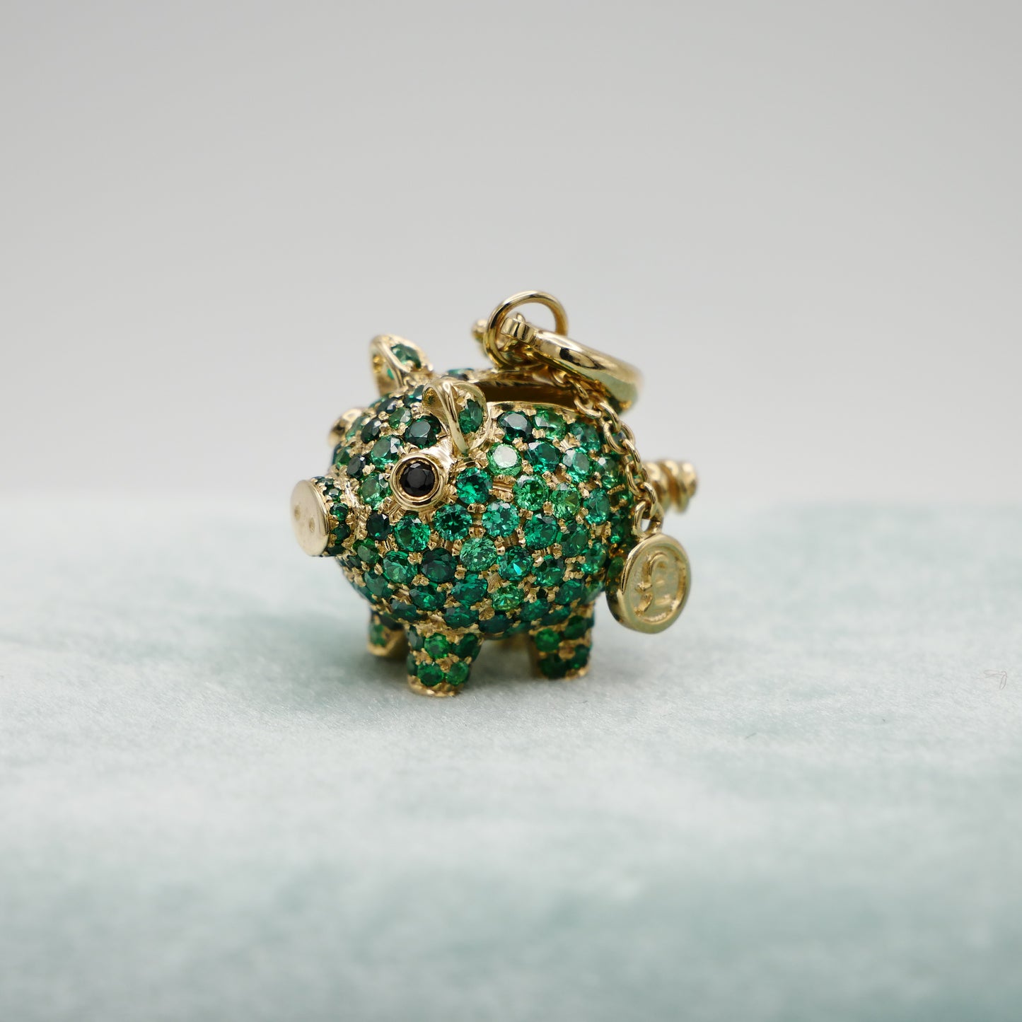 This enchanting baby piggy bank charm in 9K yellow gold sparkles with an array of lab-grown emeralds in varying sizes and captivating shades of green. Every adorable detail from the curly tail to tiny legs is beautifully pavé-set with emeralds that create a mesmerizing gradient effect. This whimsical pendant symbolizes prosperity and bright futures ahead. The substantial 9K gold construction ensures this precious piece will be treasured for generations. A delightful addition to any charm collection that brings joy and sparkle to every viewer.