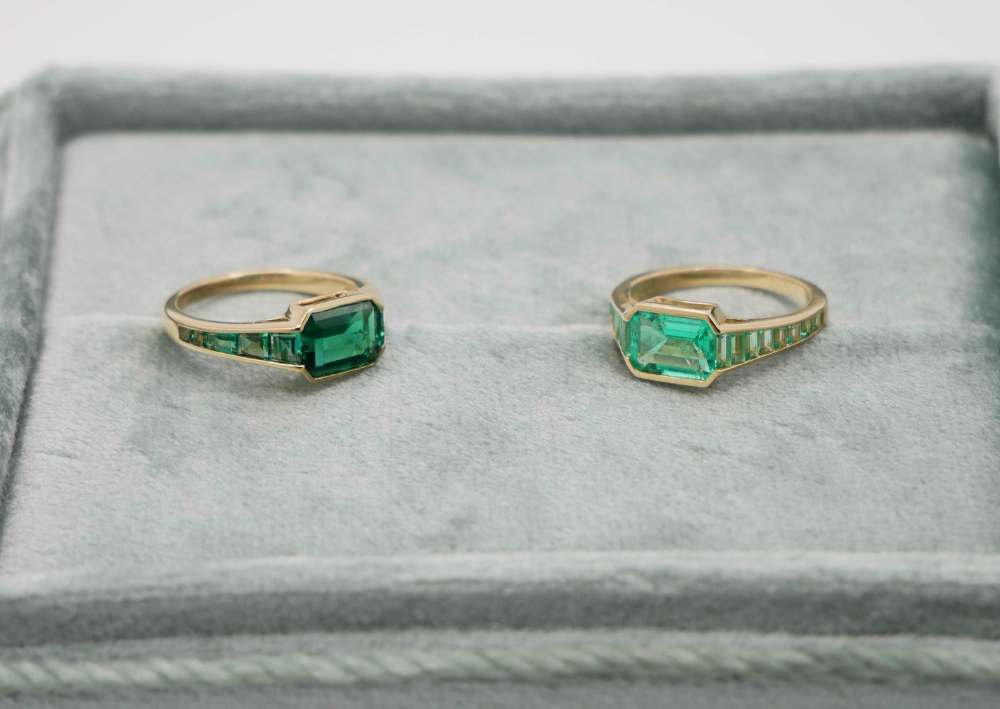 At the centerpiece of this lab grown Colombian emerald ring is a radiant 1.5 ct emerald, set east west to highlight its natural allure. Flanking it are calibre cut emeralds, each uniquely shaped to create a seamless gradient effect, making every ring truly one-of-a-kind. Set in luxurious 18K yellow gold, this ring exudes timeless charm.