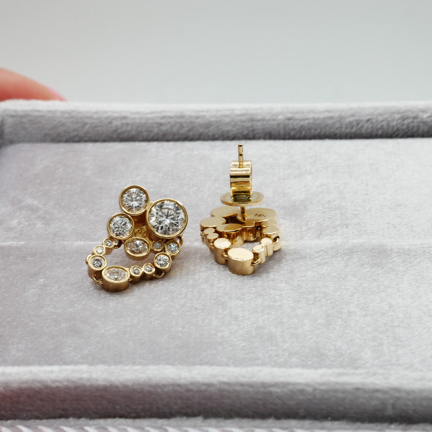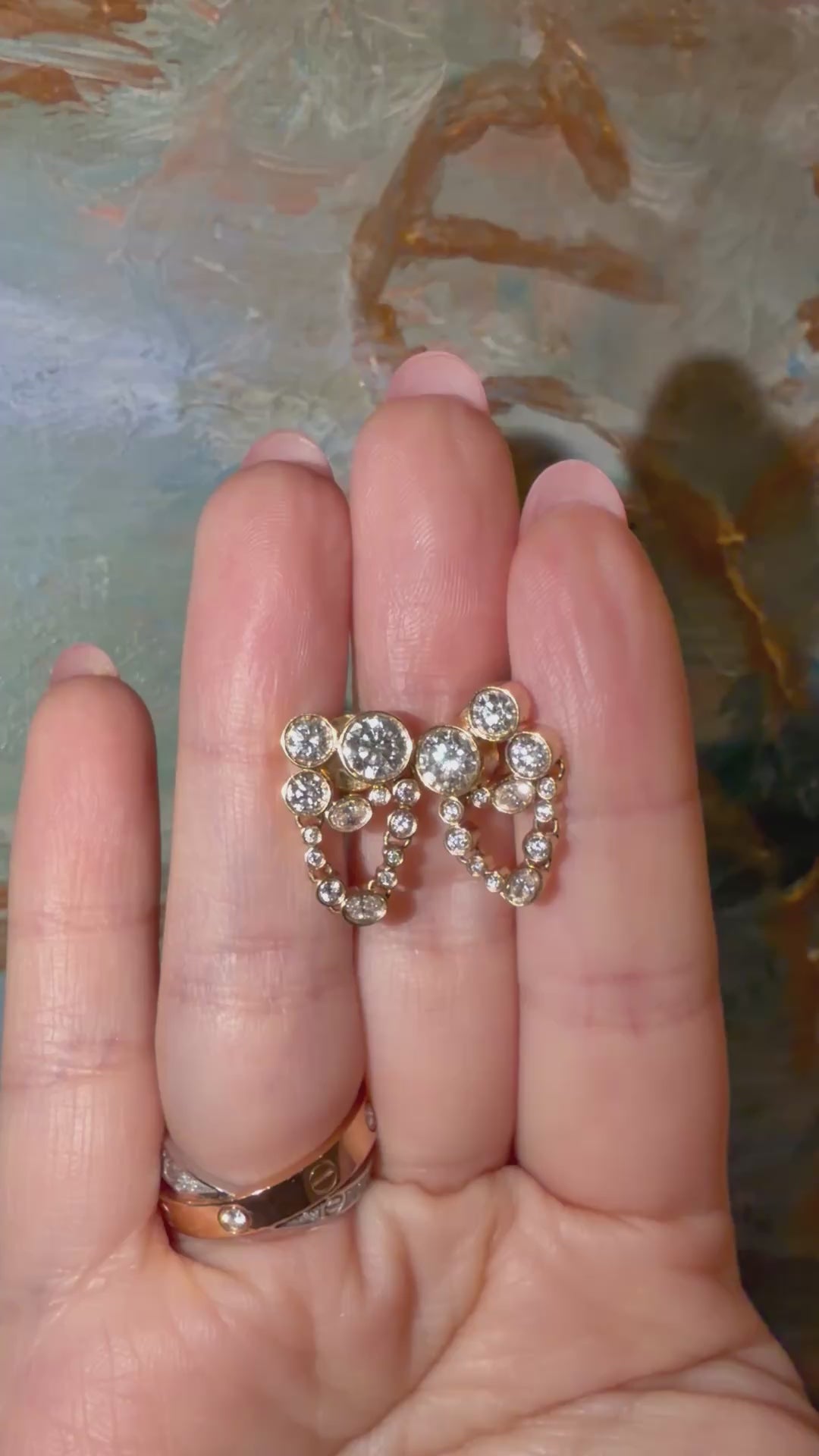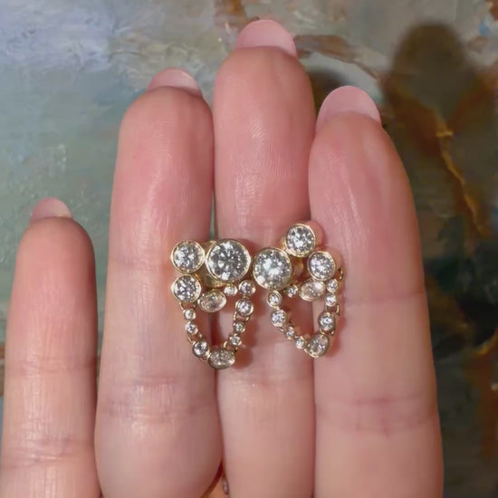 These ingenious earrings create the illusion of multiple piercings with their graduated bezel-set diamonds (or moissanites) that form an elegant arc. Crafted in 18K gold and with 2 carats of lab diamonds, each earring features stones in varying sizes that culminate in a delicate dangling loop, adding movement and catching light from every angle. The clever design combines the edgy look of an ear party with the convenience of a single post. Perfect for those who want the curated ear trend without the commitment of additional piercings. The mix of stationary and swinging elements creates a dynamic interplay of sparkle with every turn of the head.