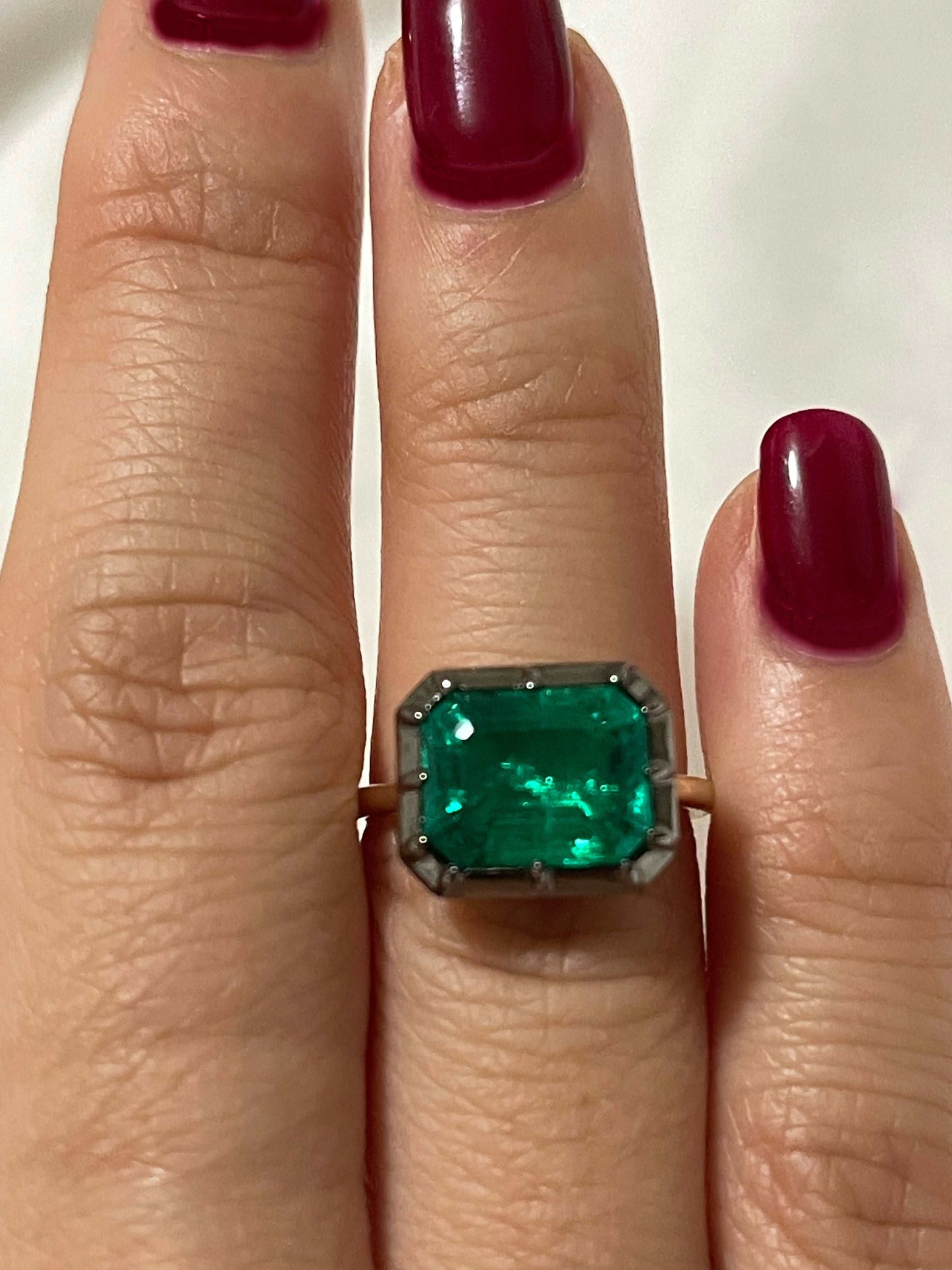 The Georgian-Victorian Emerald Cut Emerald & Blackened Gold East West Button Back Collet Ring—a timeless engagement piece inspired by the grace of the Georgian and Victorian periods. This ring, featuring a stunning 3.5 ct lab-grown emerald in a Georgian cut-down collet setting and button back, exudes a timeless yet modern charm. It's not just an engagement ring; it's a versatile piece designed for stacking and layering with other styles.