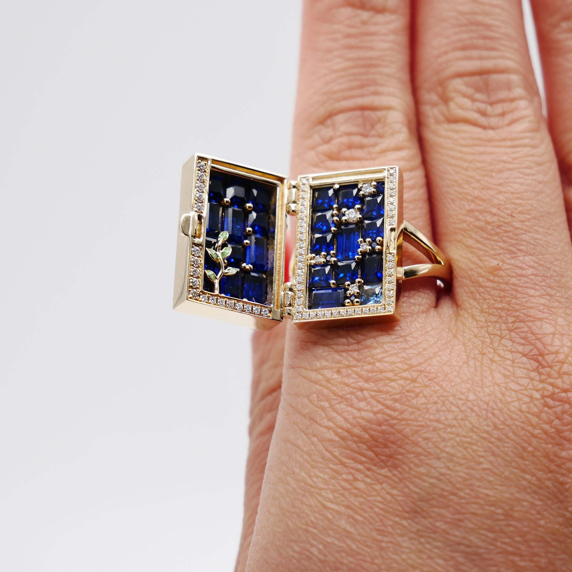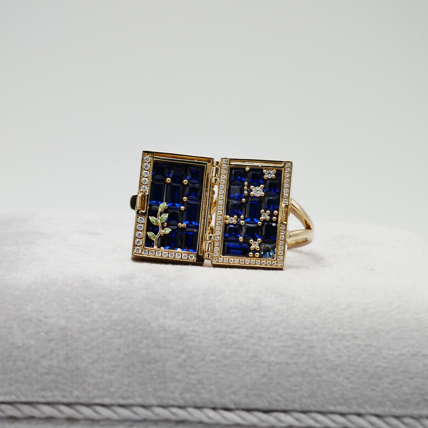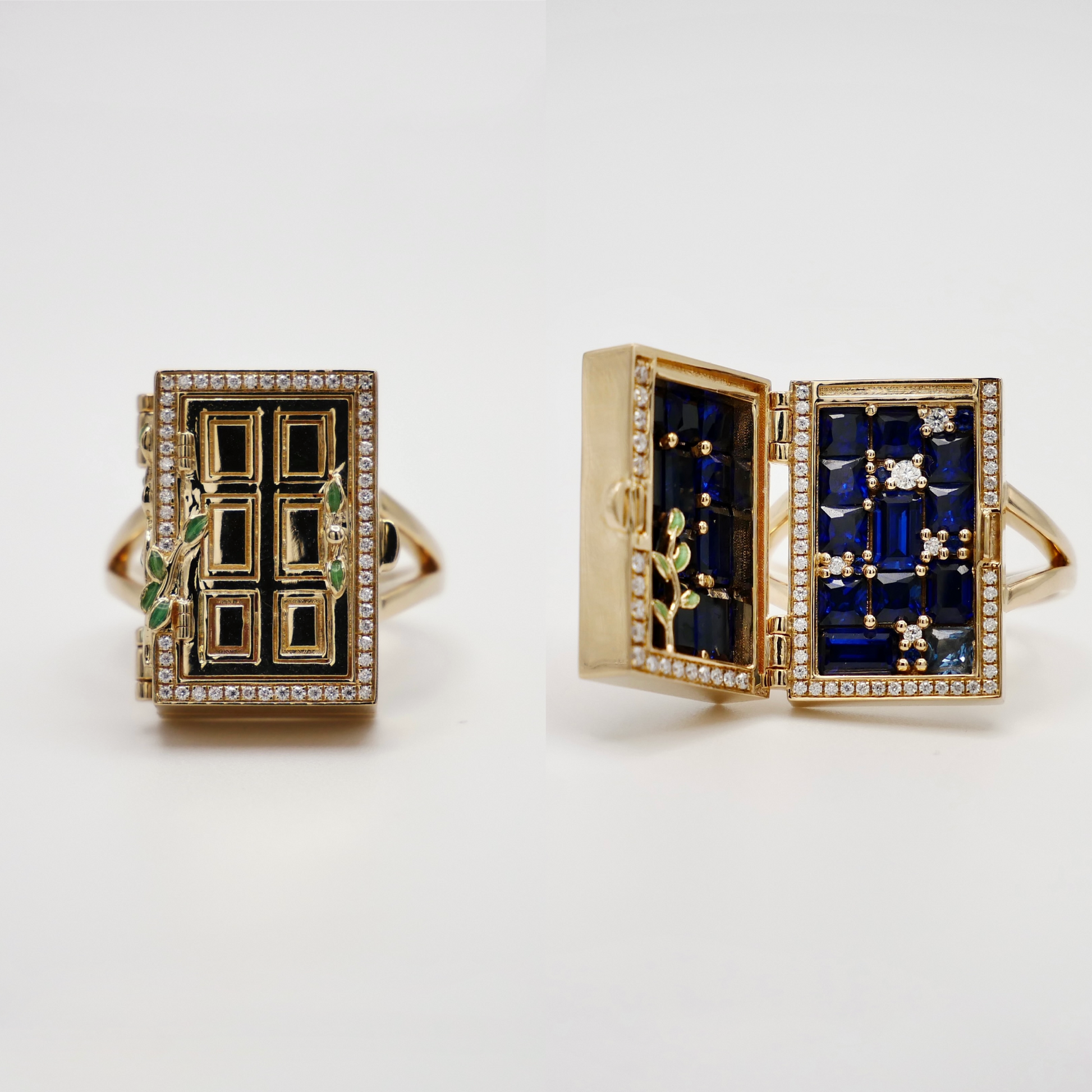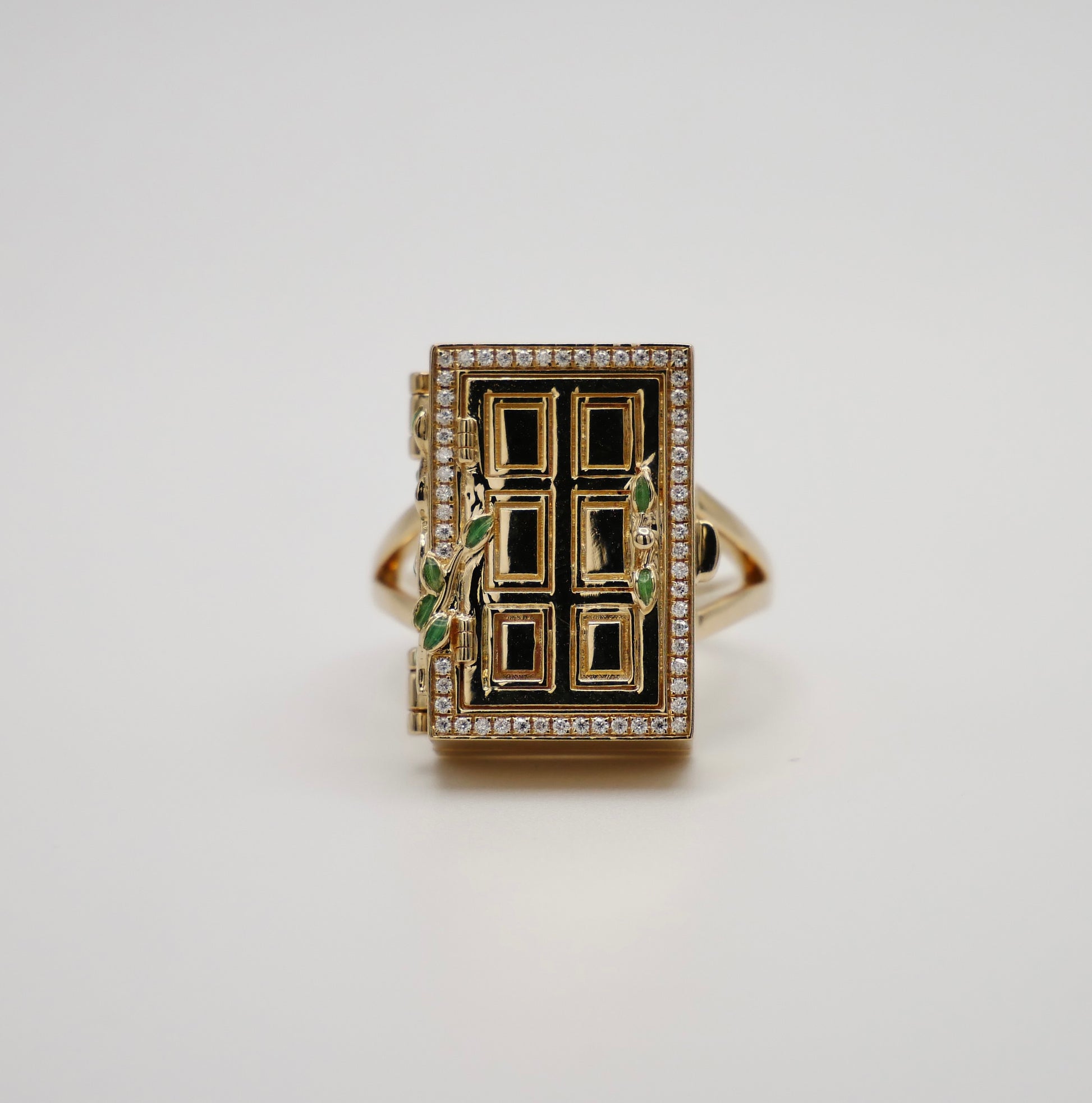Unlock a world of enchantment with our 14K yellow gold ring, inspired by the mystical door from the beloved tale of Suzume no Tojimari. This exquisitely crafted piece features a delicate door motif, surrounded by a frame of sparkling pave moissanites that capture the light with every movement. Green enameled leaves gracefully climb up the door, adding a touch of nature-inspired beauty to the design. Intriguingly, the door opens to reveal a hidden treasure: a stunning array of lab-grown sapphires and moissanites, arranged to dazzle and delight.