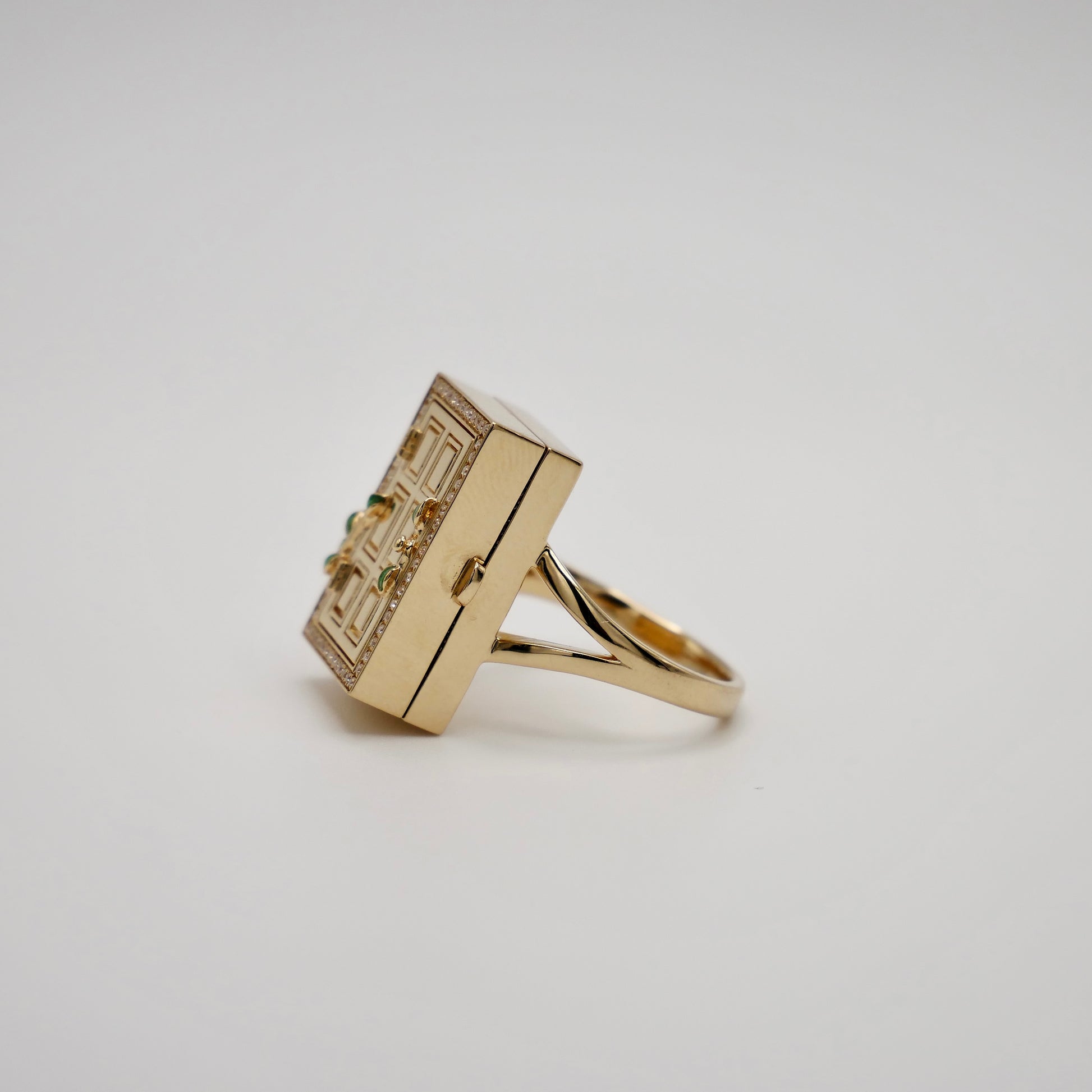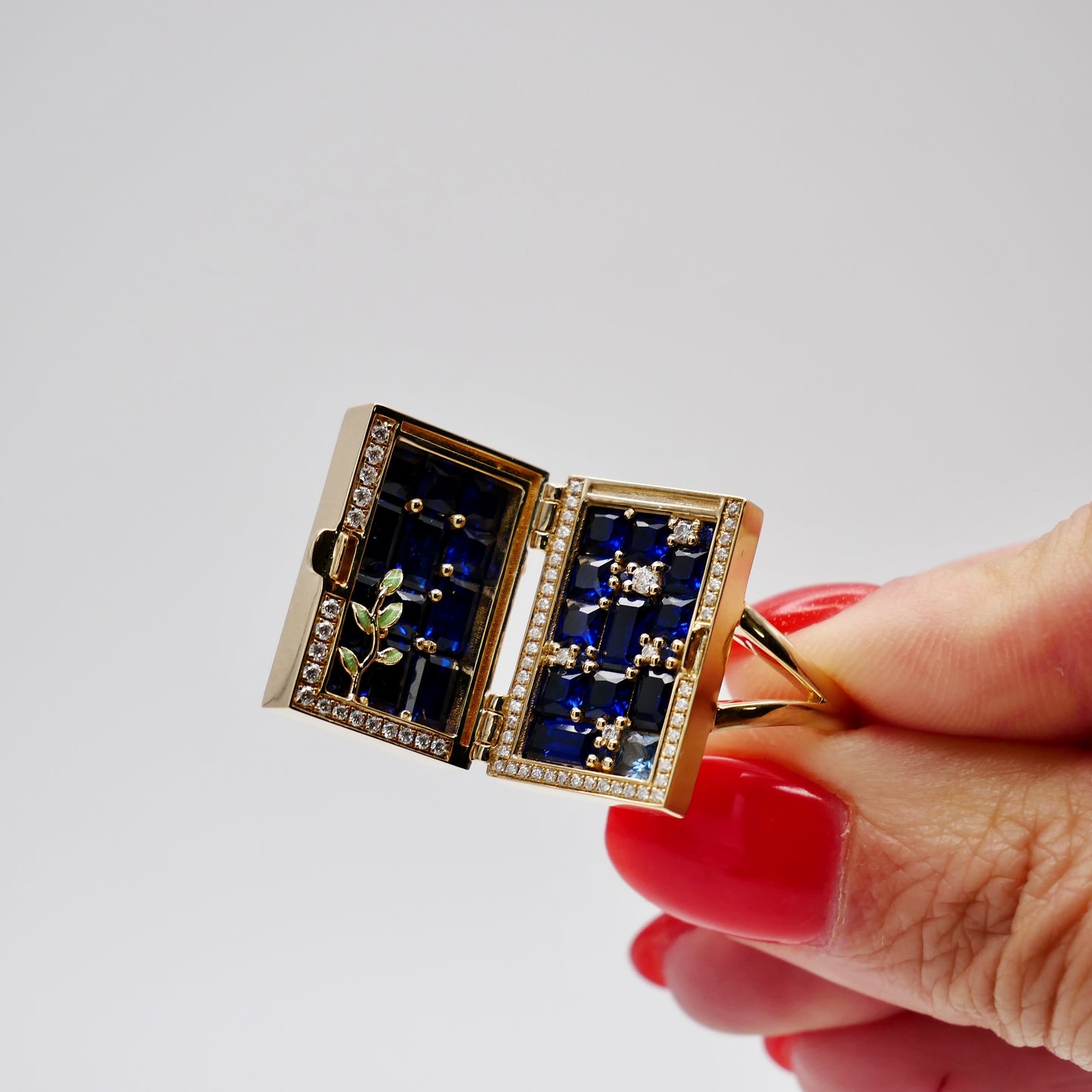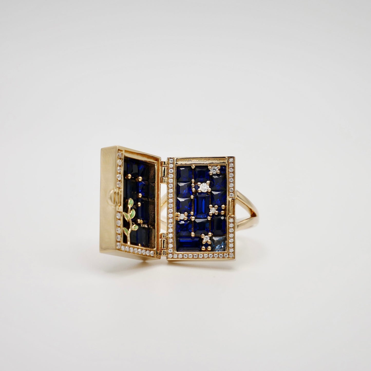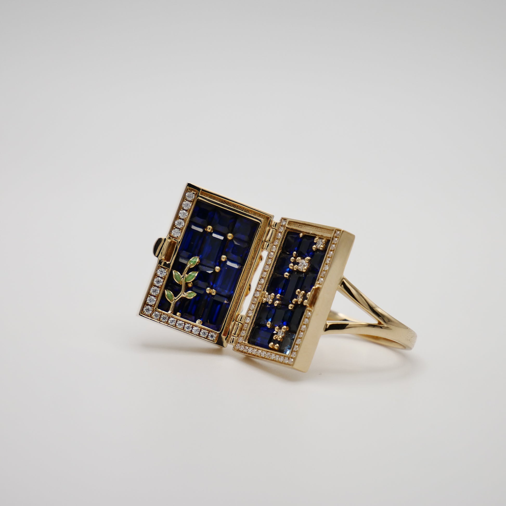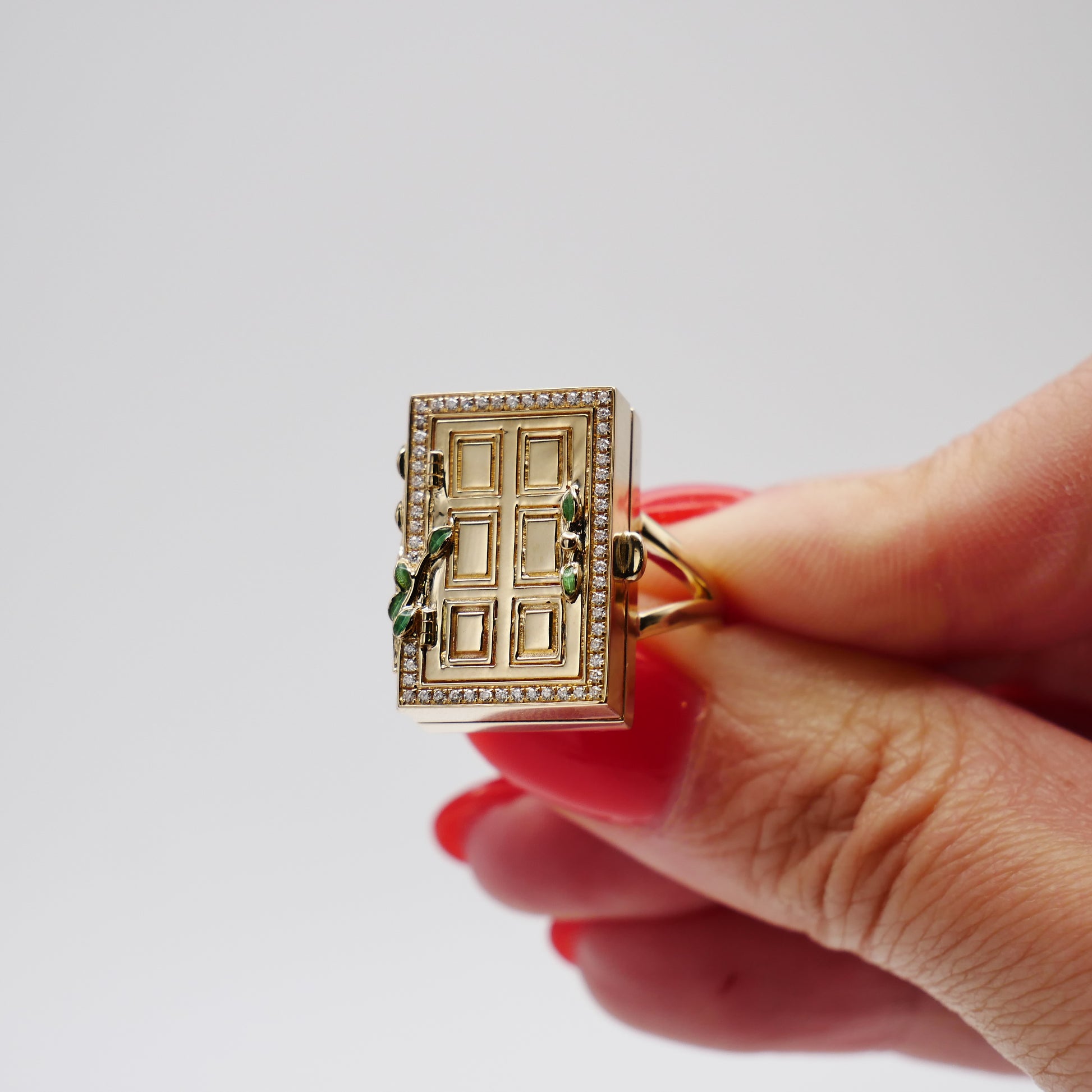 Unlock a world of enchantment with our 14K yellow gold ring, inspired by the mystical door from the beloved tale of Suzume no Tojimari. This exquisitely crafted piece features a delicate door motif, surrounded by a frame of sparkling pave moissanites that capture the light with every movement. Green enameled leaves gracefully climb up the door, adding a touch of nature-inspired beauty to the design. Intriguingly, the door opens to reveal a hidden treasure: a stunning array of lab-grown sapphires and moissanites, arranged to dazzle and delight.