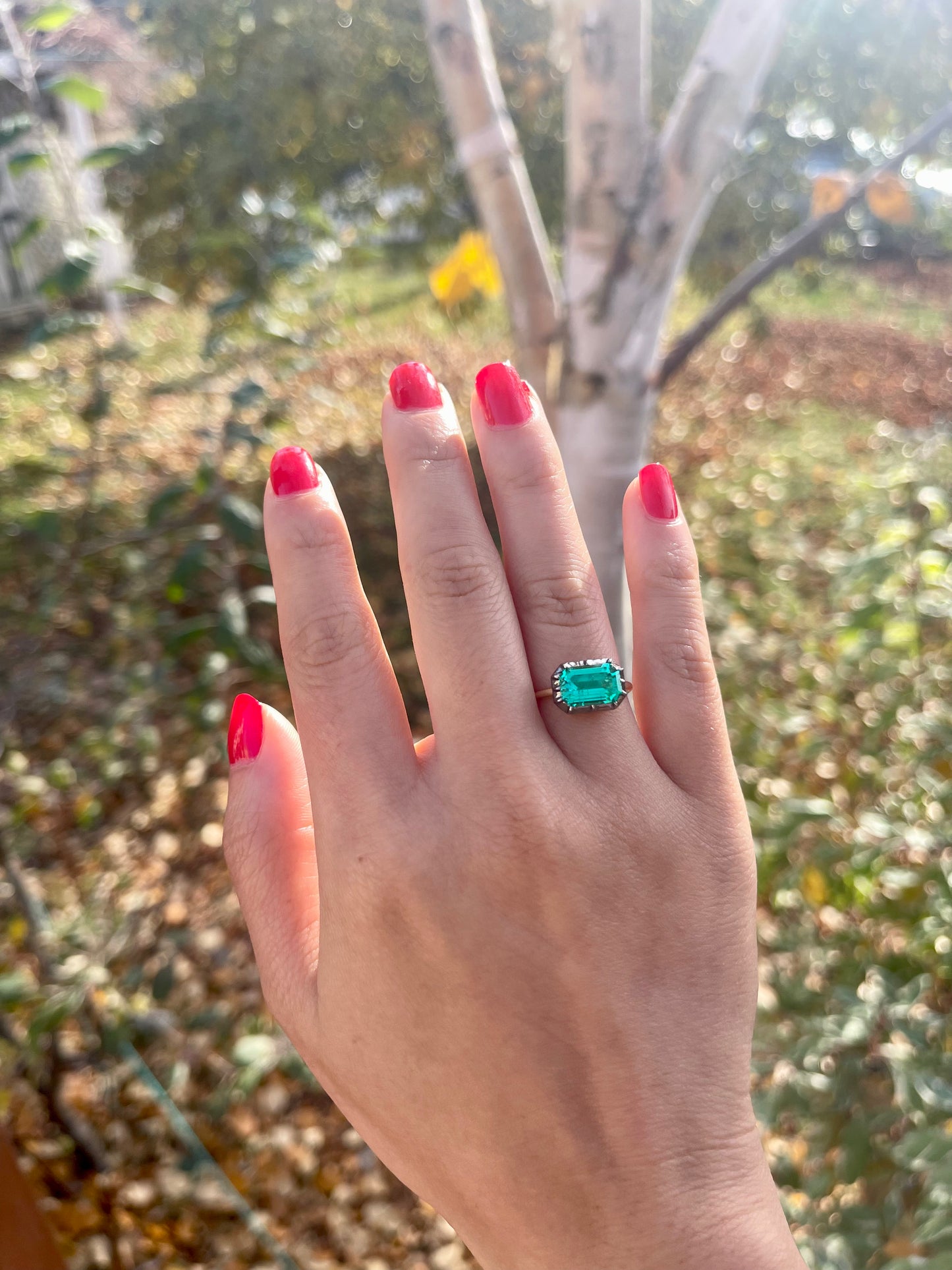 The Georgian-Victorian Emerald Cut Emerald & Blackened Gold East West Button Back Collet Ring—a timeless engagement piece inspired by the grace of the Georgian and Victorian periods. This ring, featuring a stunning 3 ct lab-grown emerald in a Georgian cut-down collet setting and button back, exudes a timeless yet modern charm. It's not just an engagement ring; it's a versatile piece designed for stacking and layering with other styles.