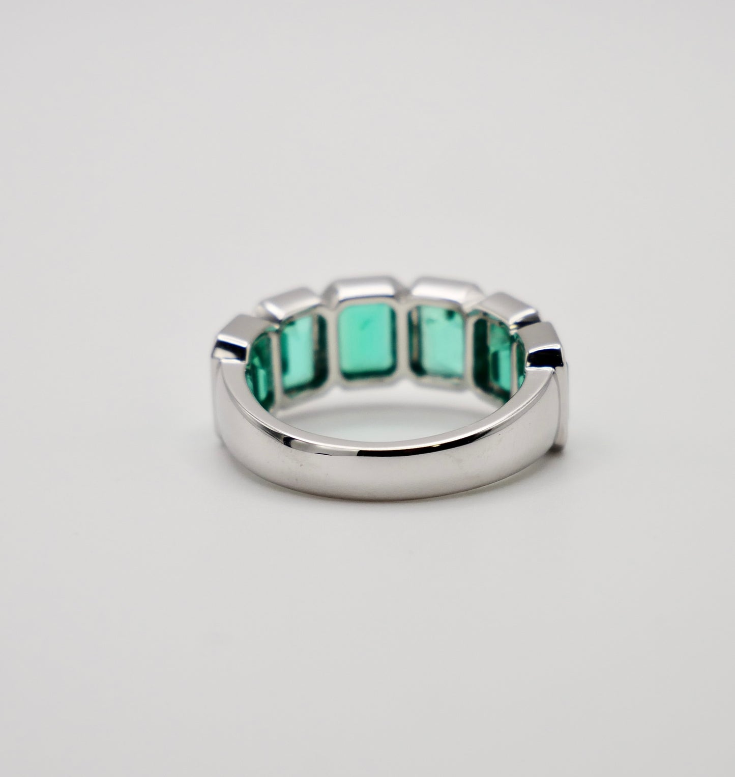 This stunning half eternity band is crafted with emerald cut lab-grown emeralds set in sleek bezel settings that beautifully frame each stone. Crafted in platinum, the modern bezel design provides both security and a contemporary aesthetic while allowing maximum light to enhance the emeralds' vibrant green brilliance. This ring ring makes an ideal anniversary band, statement piece, or meaningful gift that celebrates both timeless elegance and modern values.