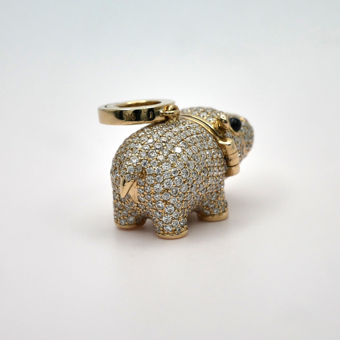 This 14K yellow gold baby hippo locket pendant is adorned with sparkling moissanites and sapphires. This delightful piece captures the playful spirit of a baby hippopotamus in stunning detail. Crafted with care, the locket opens to hold a cherished memory, making it a perfect gift for animal lovers or a special addition to your jewelry box. Whether for a holiday surprise or a personal treat, this enchanting locket is sure to bring a smile to anyone’s face. The hippo measures 22 x 13 x 12 mm, and the clasp adds an additional 6 mm to the overall height.