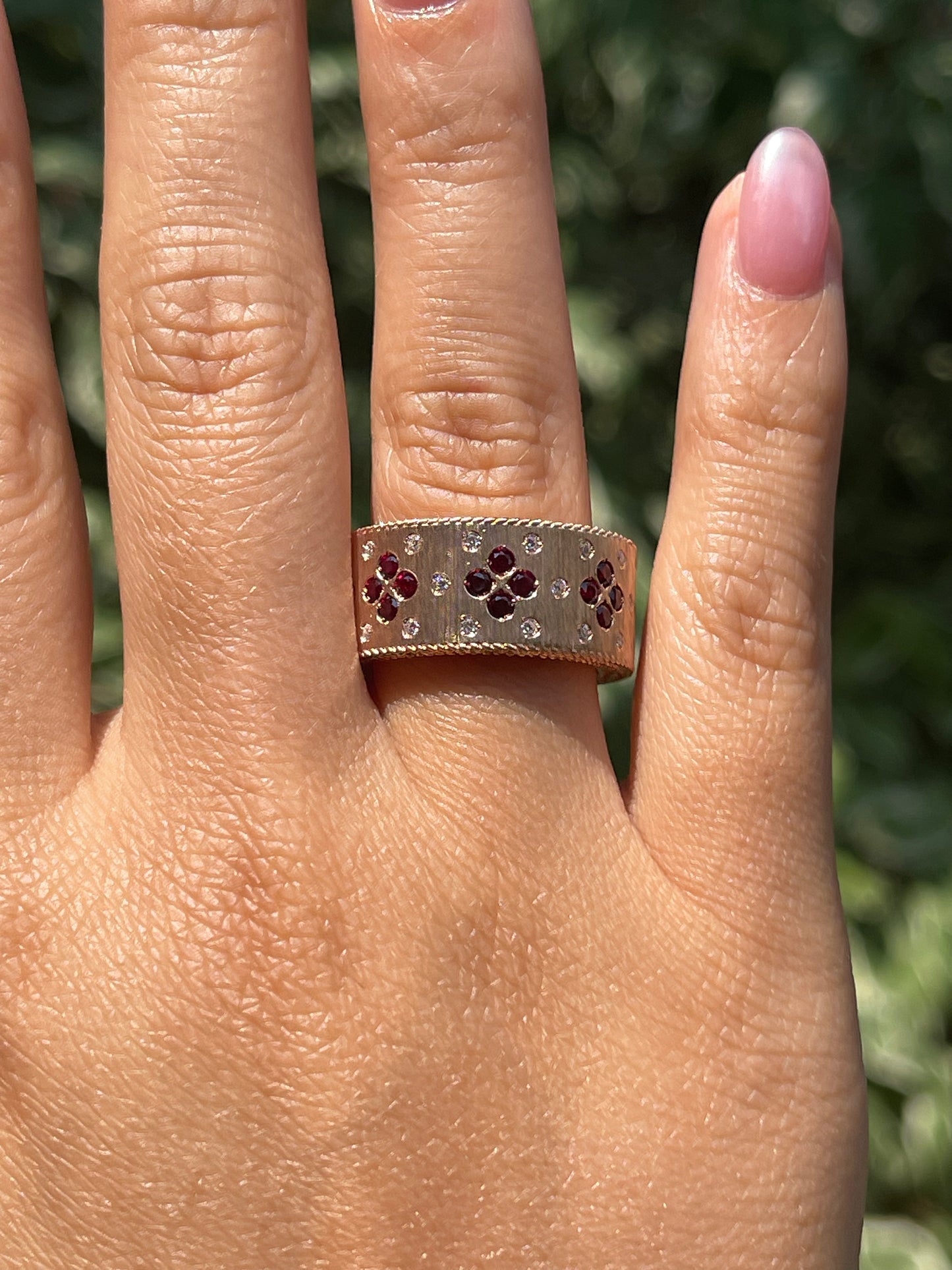 Indulge in the luxurious allure of our 14k Engraved Rose Gold Silk-Inspired Ring, a masterpiece of craftsmanship and elegance. With a generous width of 10mm, this ring captivates with intricate engravings that artfully mimic the soft folds of silk fabric, adding a touch of timeless sophistication to your ensemble. Adorned with a delicate lab ruby and moissanite flower inlay, each petal sparkles with brilliance, creating a harmonious blend of opulence and nature-inspired beauty. Buccellati Macri Yellow Diamond with Rubies Ring