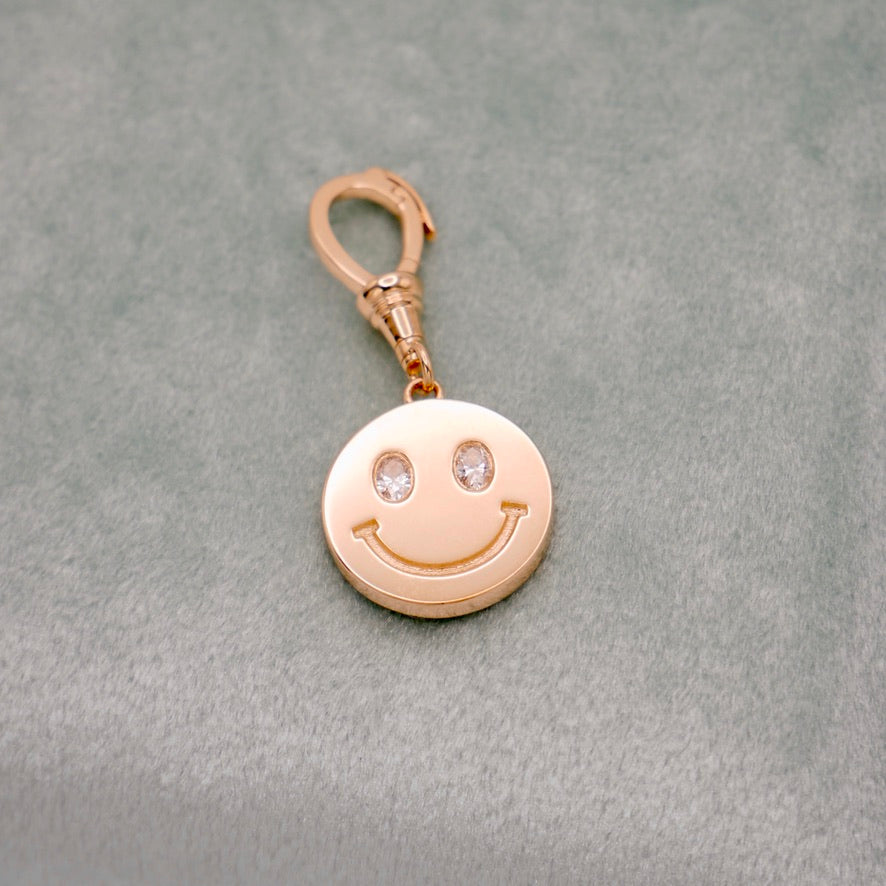 This delightful 14K gold happy face pendant sparkles with two 0.2 carat oval diamonds or moissanites, set to bring a smile to anyone's day. The face's charming features are enhanced by a swivel Albert clip, allowing for easy attachment to any chain or charm bracelet. Perfect for those who love a touch of whimsy paired with luxurious flair, this pendant combines joyous charm with practical elegance. Whether as a gift or a personal treat, it’s a versatile addition to any jewelry collection, sure to brighten your wardrobe.