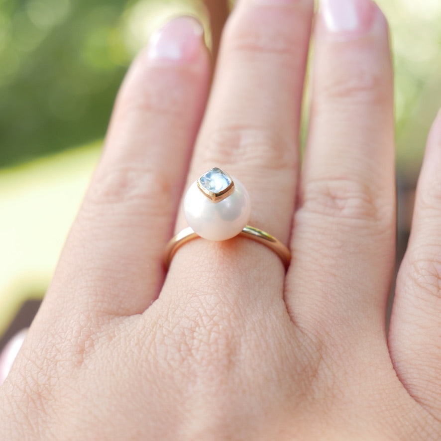 This 14K yellow gold ring features a central 10 mm freshwater pearl beautifully contrasted by a square-shaped 5 mm aquamarine cabochon. Set on a polished yellow gold band, this ring marries classic allure with contemporary design. Perfect for both special occasions and everyday sophistication, it’s a stunning addition to any jewelry collection.