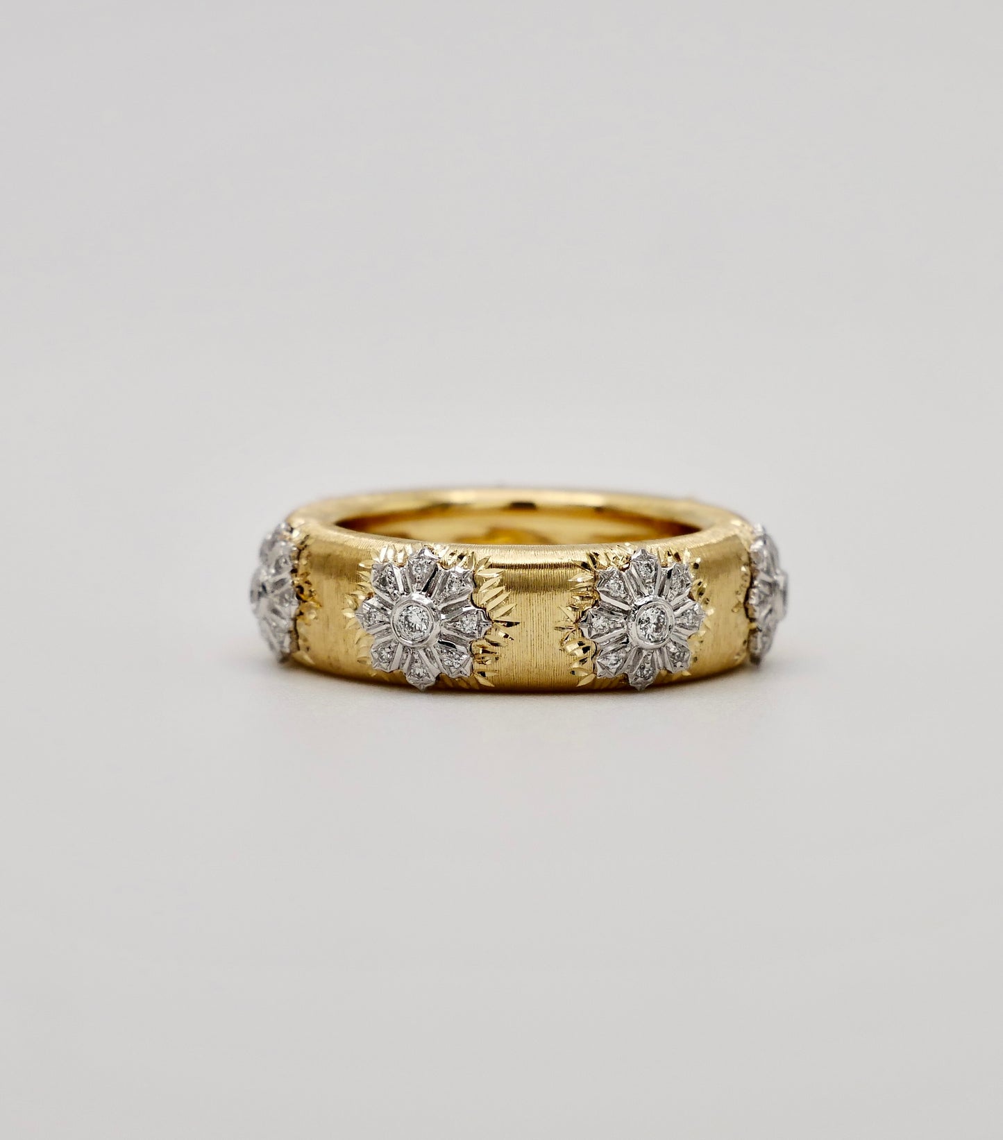 Indulge in the luxurious allure of our 18k Engraved Gold Silk-Inspired Ring, a masterpiece of craftsmanship and elegance. With a width of 4mm, this ring captivates with intricate engravings that artfully mimic the soft folds of silk fabric, adding a touch of timeless sophistication to your ensemble. Adorned with a delicate diamond flower inlay, each petal sparkles with brilliance, creating a harmonious blend of opulence and nature-inspired beauty. White gold studs accentuate the design, contributing a contemporary edge to this exquisite piece.