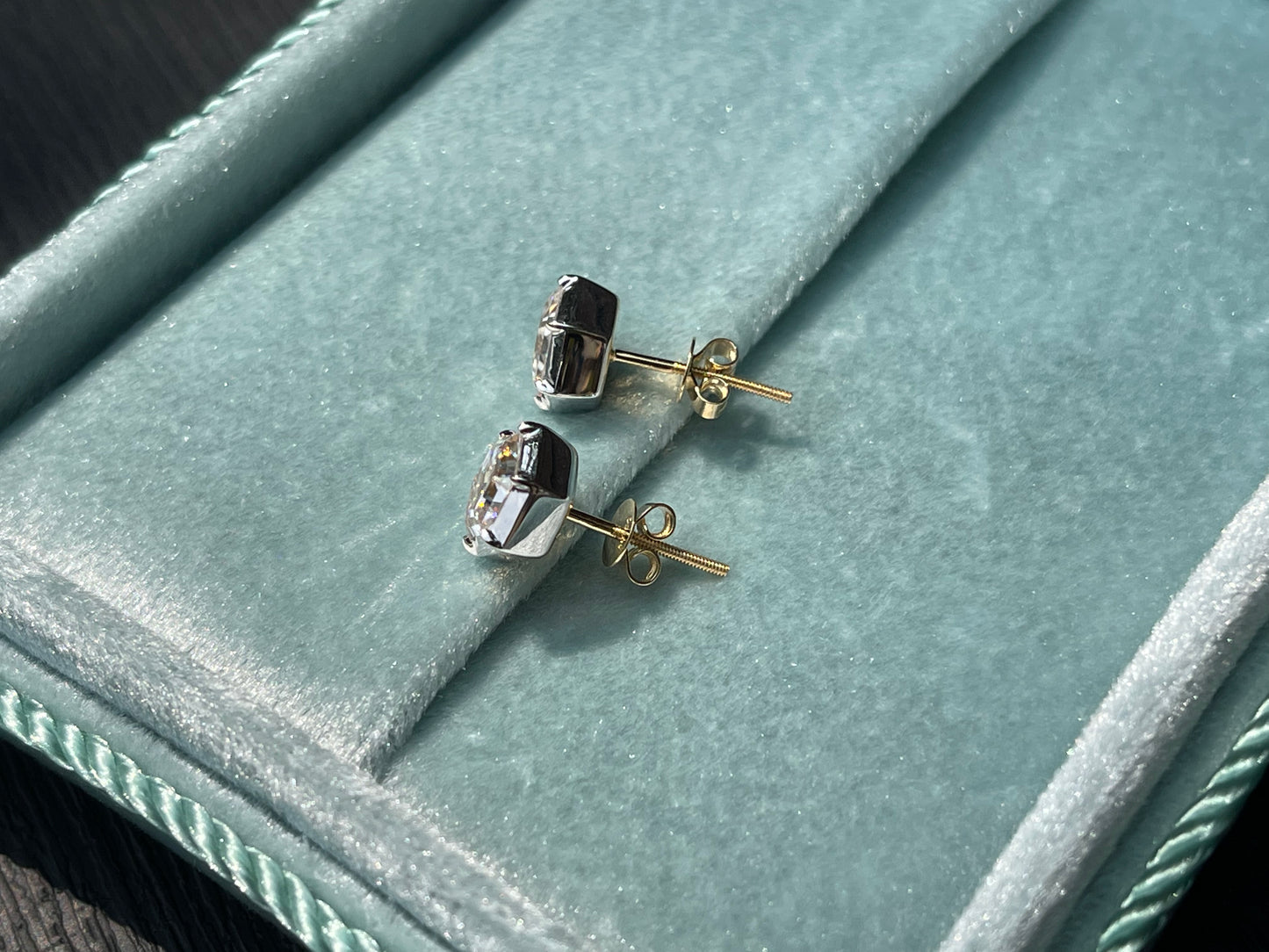 A pair of beautiful Georgian Victorian hexagon stud earrings, set with 3 carats (1.5 carat each) of brilliant cut moissanites or diamonds in Georgian cut down collet setting, handcrafted in 18k white gold and 18k yellow gold.