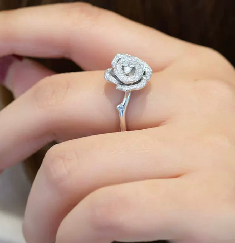 The Rose Bloom Ring is crafted in 18K white gold and adorned with approximately 0.4 carats of natural diamonds, showcasing timeless elegance with a 13 mm (0.5 inch) motif diameter.