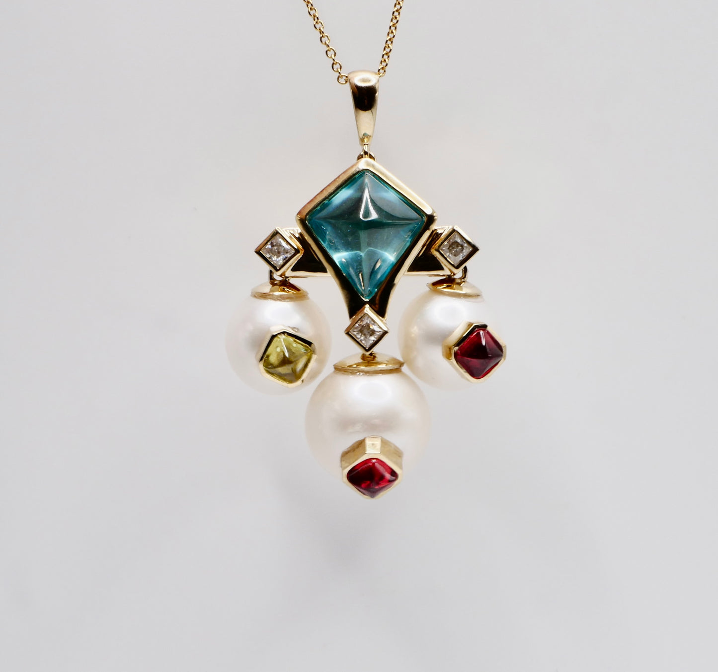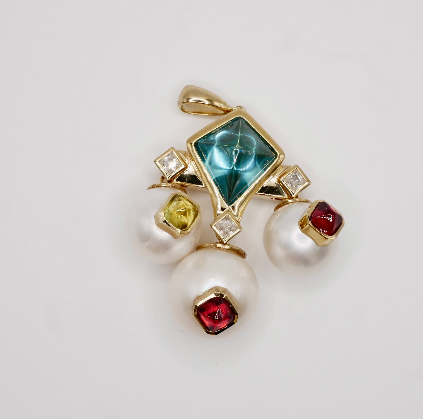 Art Deco Geometric Pearl and Multi-Gemstone Cabochon, 9K Yellow Gold Statement Pendant
