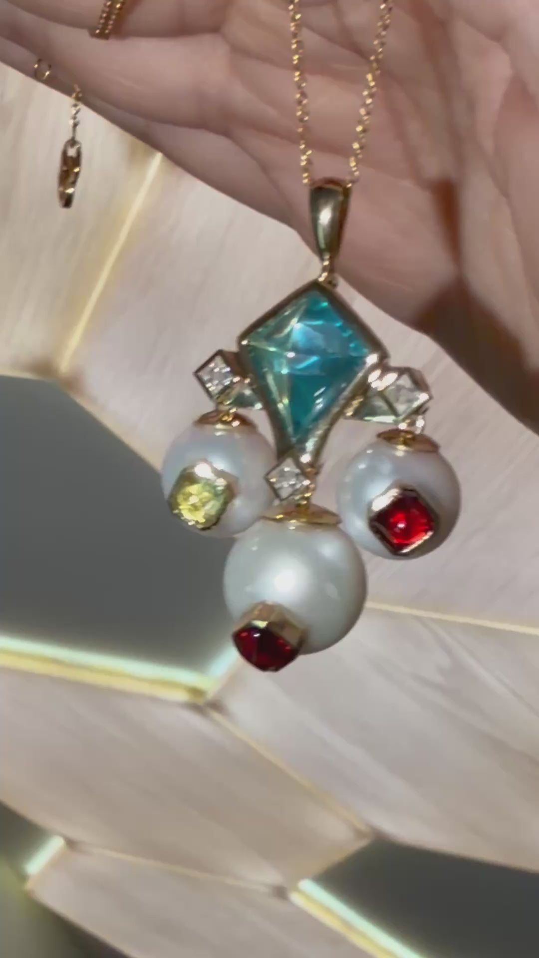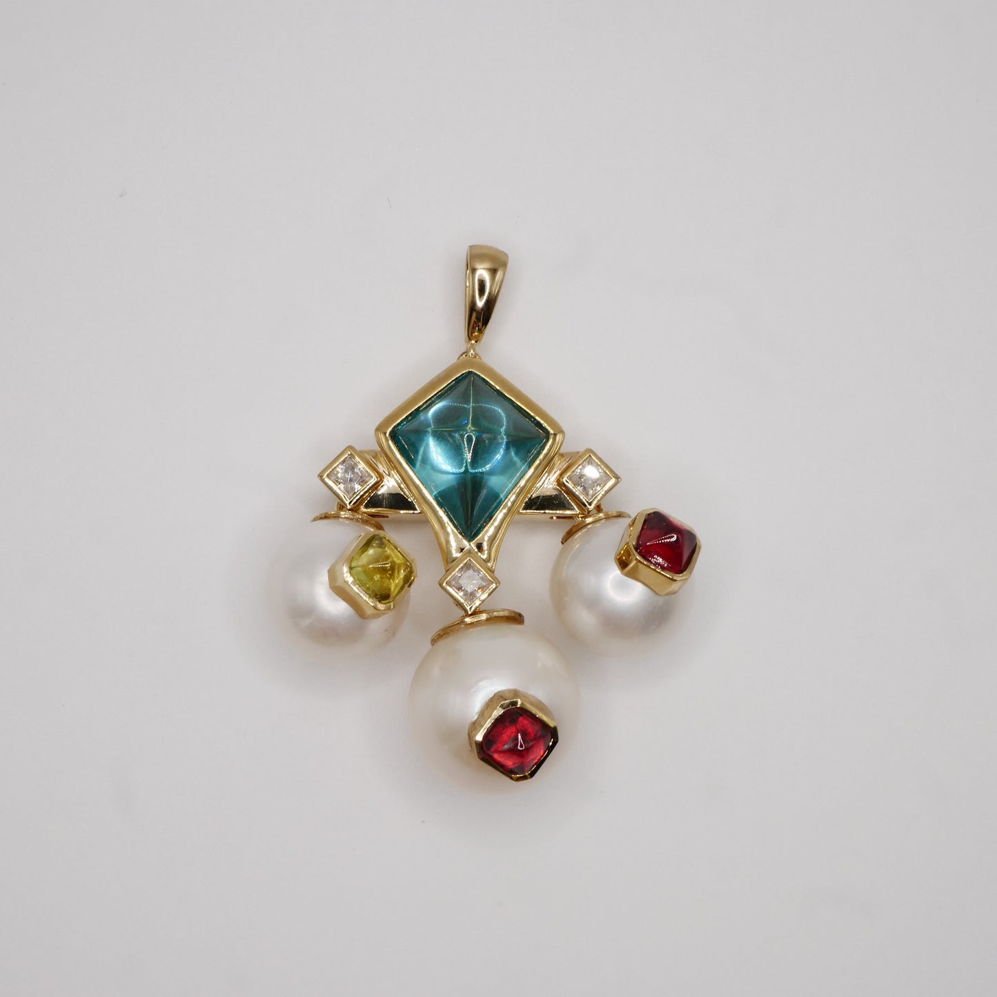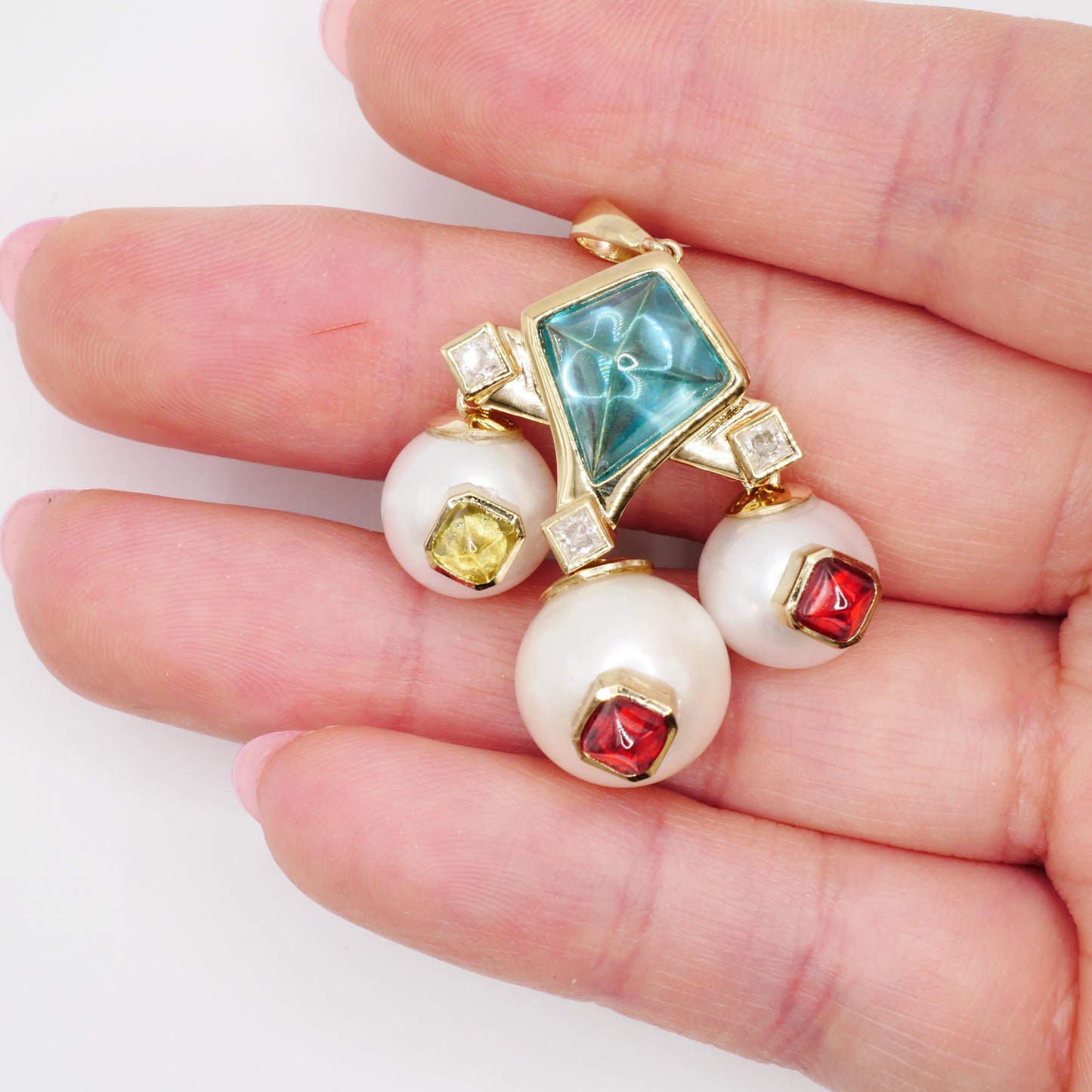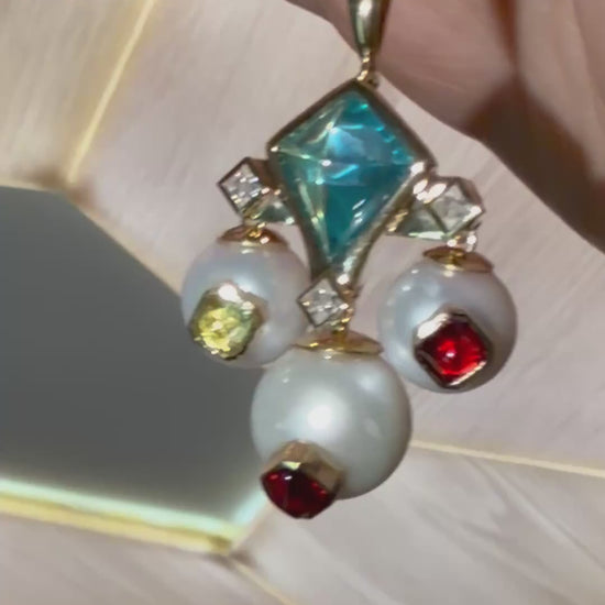 This extraordinary pendant showcases masterful geometric design with a striking kite-shaped aquamarine cabochon as its centerpiece, surrounded by lustrous pearls and a rainbow of candy-colored cabochons. At 40 mm, the pendant makes a bold statement with its Art Deco-inspired architecture, featuring princess-cut moissanites that add brilliant sparkle between the smooth dome-shaped gems. The playful combination of vibrant peridot, rich ruby, and royal amethyst cabochons creates a confectionery effect against the creamy pearls, all set in warm 9K gold. The design strikes a perfect balance between vintage glamour and contemporary whimsy. Marina B Aquila Pendant, Bvlgari, Bulgari