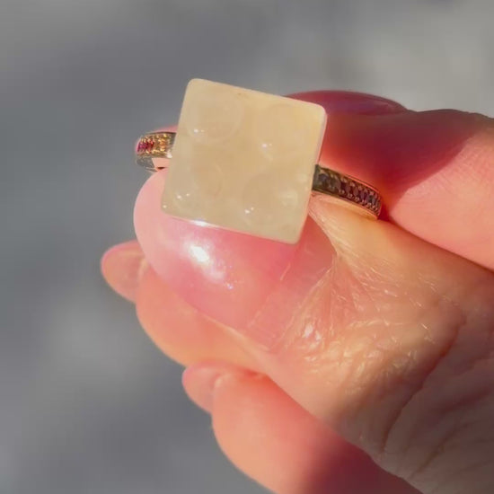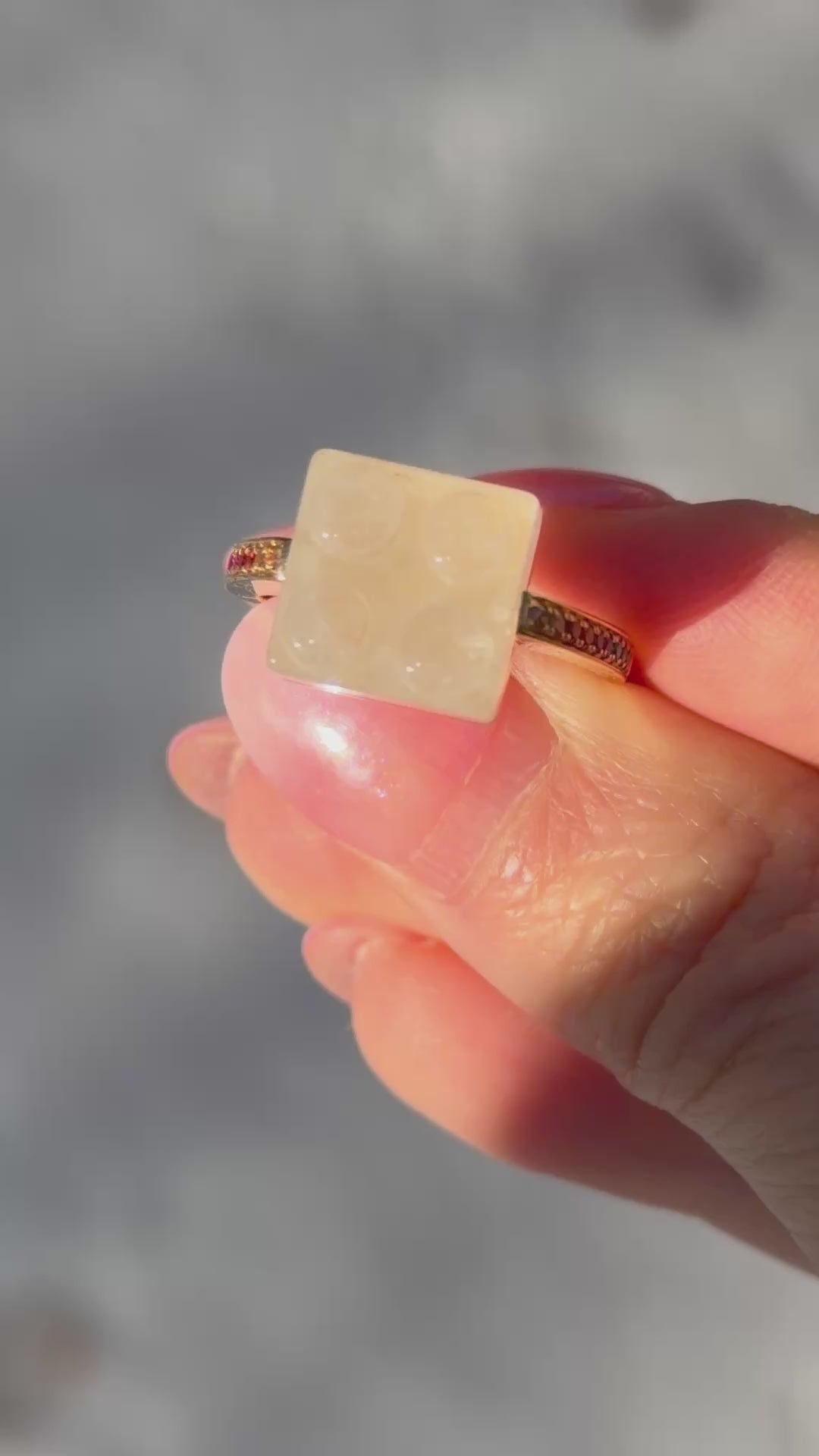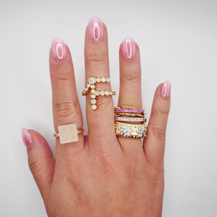 This playful yet sophisticated ring reimagines childhood nostalgia through the lens of fine jewelry. The centerpiece features a precisely cut white quartz "brick" that captures the iconic interlocking design we all remember from our toy boxes, now elevated with precious materials. The band sparkles with a rainbow of lab-grown sapphires - pink, orange, yellow, green, blue, and purple - creating a vibrant spectrum that wraps around the finger. Each sapphire is carefully set to complement the geometric precision of the quartz centerpiece, bringing color and movement to the architectural design. Nadine Ghosn Building Block Ring