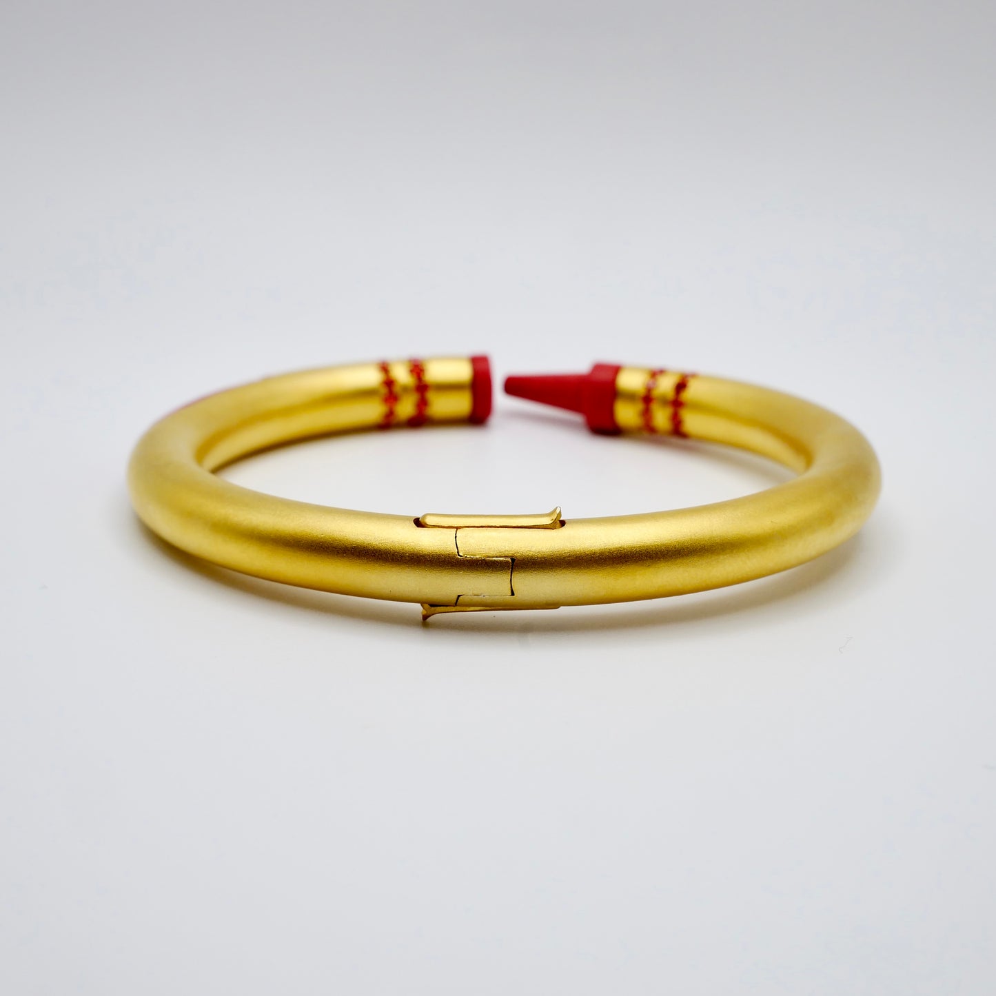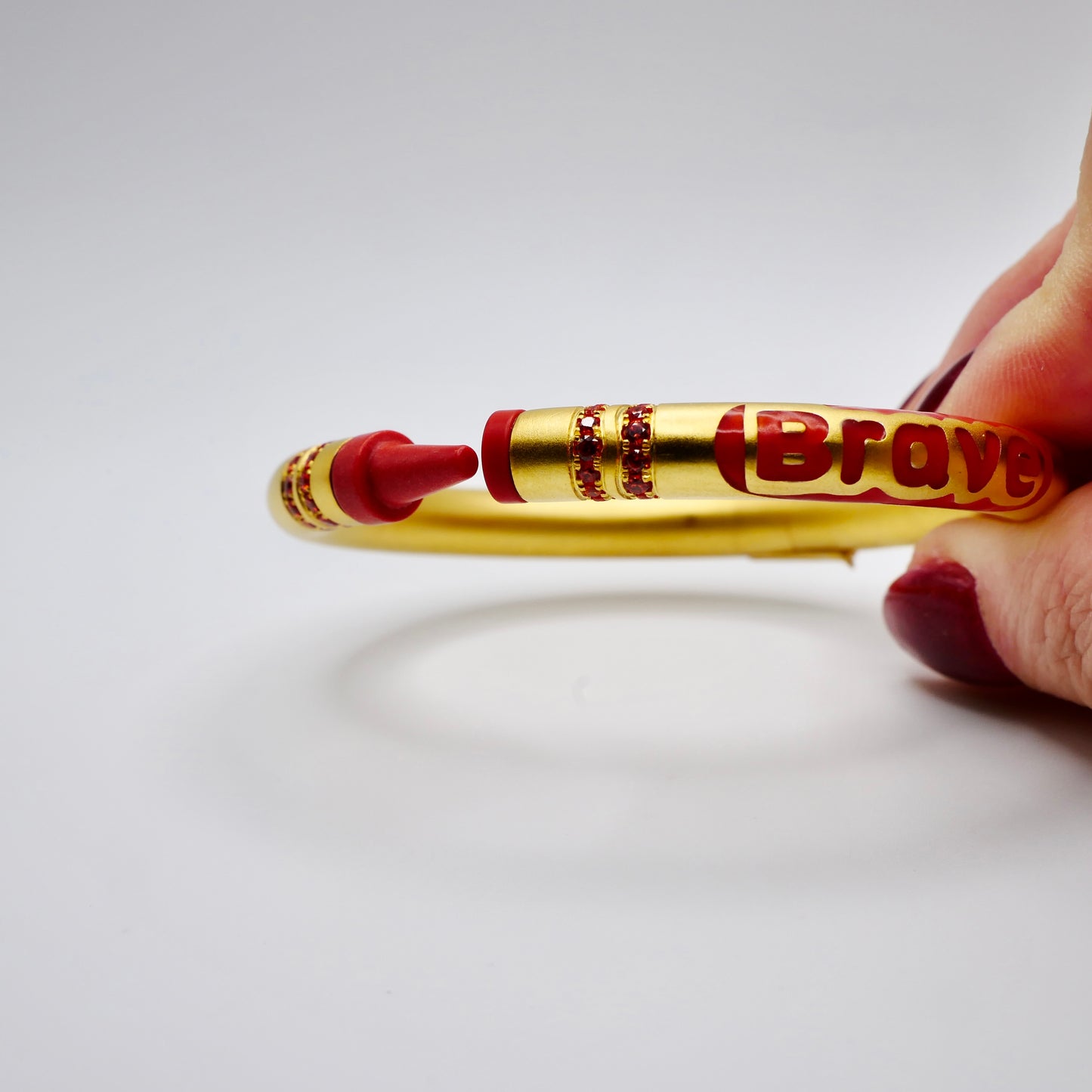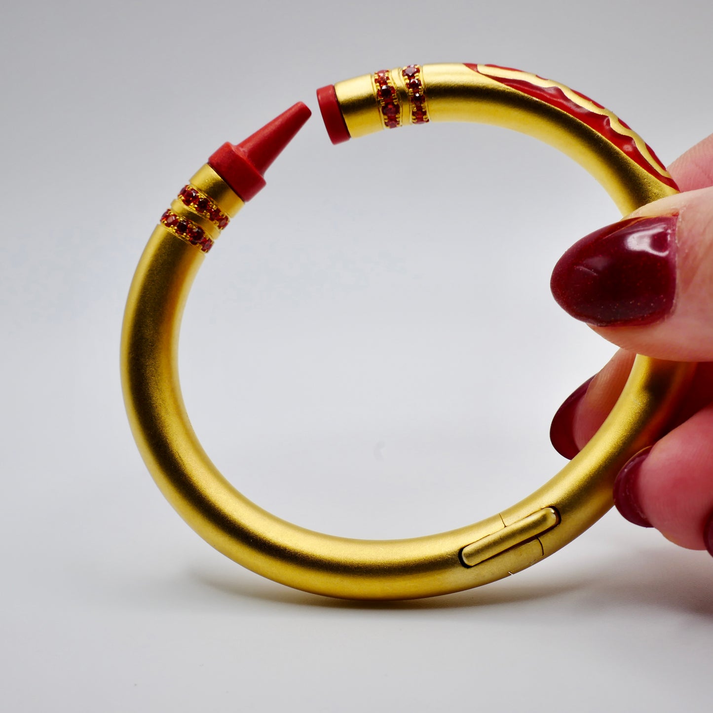 This whimsical bracelet transforms the classic coloring stick into a sophisticated statement piece, featuring genuine orange coral tips and sparkling orange moissanites accent bands on 18K gold-filled metal. The magic lies in complete customization - personalize the wrapper with any name or word, and choose your preferred gemstone colors for both tips and accents. The hinged design opens smoothly for easy wear while maintaining the playful illusion of a real artist's tool. Perfect for teachers, creatives, or anyone who believes in coloring outside the lines, this bracelet brings childhood nostalgia to luxury jewelry. Each piece is individually crafted to your specifications, making it as unique as your imagination.