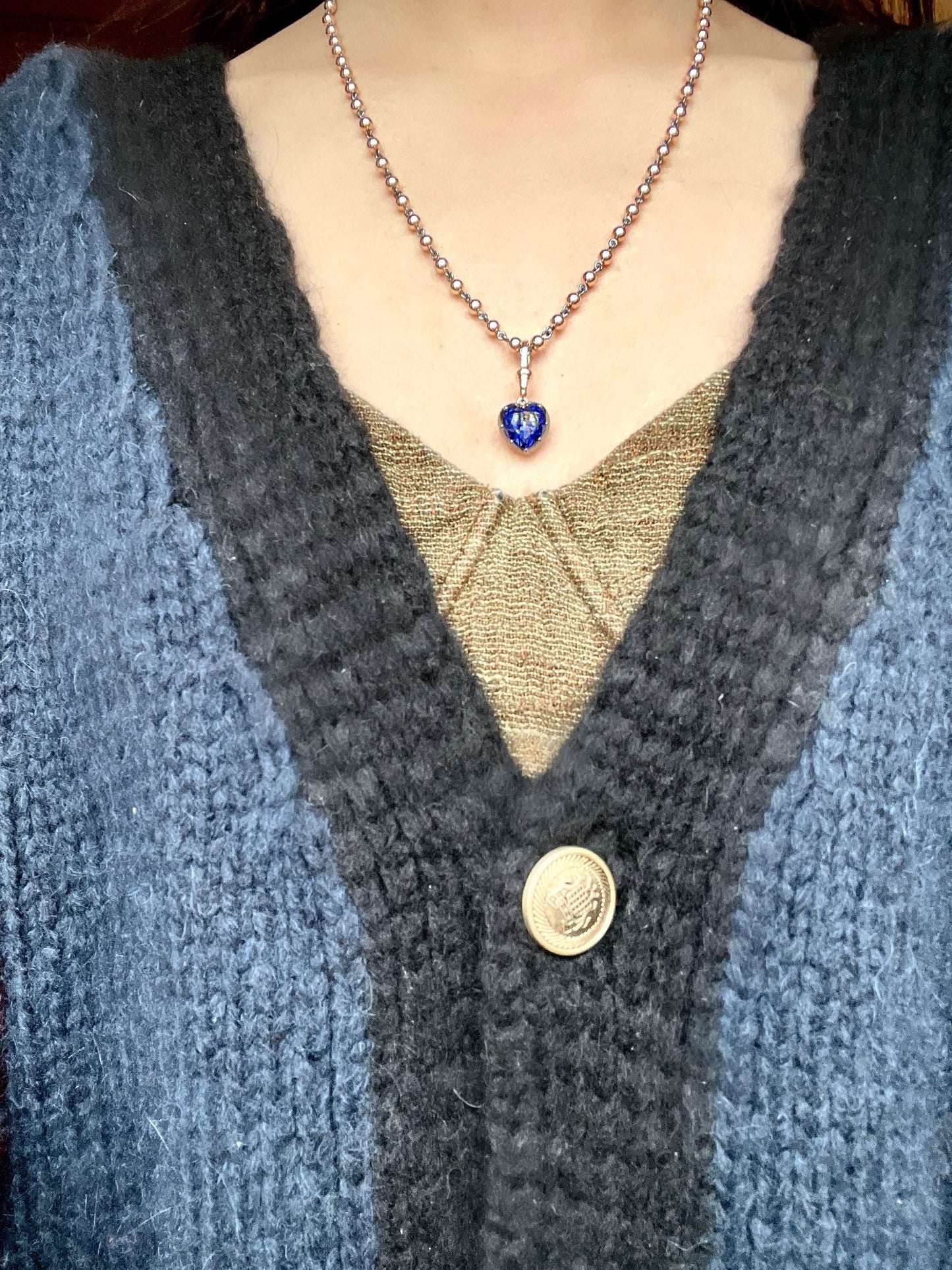 This Georgian Victorian Ball Chain Pendant is set with a 4 carat heart shaped lab sapphire (10.5 x 10.5 mm) in a Georgian cut-down down setting and is designed to hang from any of the ball chain necklaces.