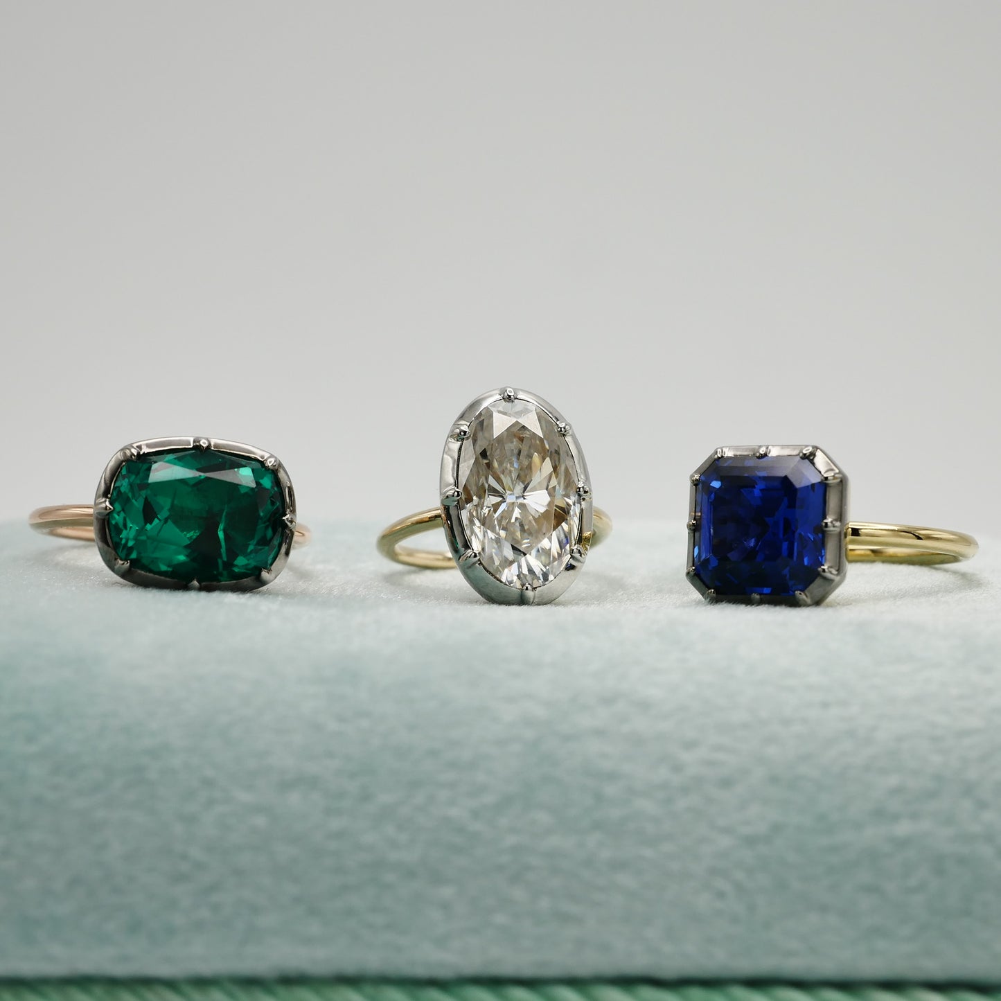 The Georgian-Victorian Elongated Cushion Cut Emerald Ring in Rose & Blackened Gold —a timeless engagement piece inspired by the grace of the Georgian and Victorian periods. This ring, featuring a stunning 4 ct lab-grown emerald in a Georgian cut-down collet setting and button back, exudes a timeless yet modern charm. It's not just an engagement ring; it's a versatile piece designed for stacking and layering with other styles.