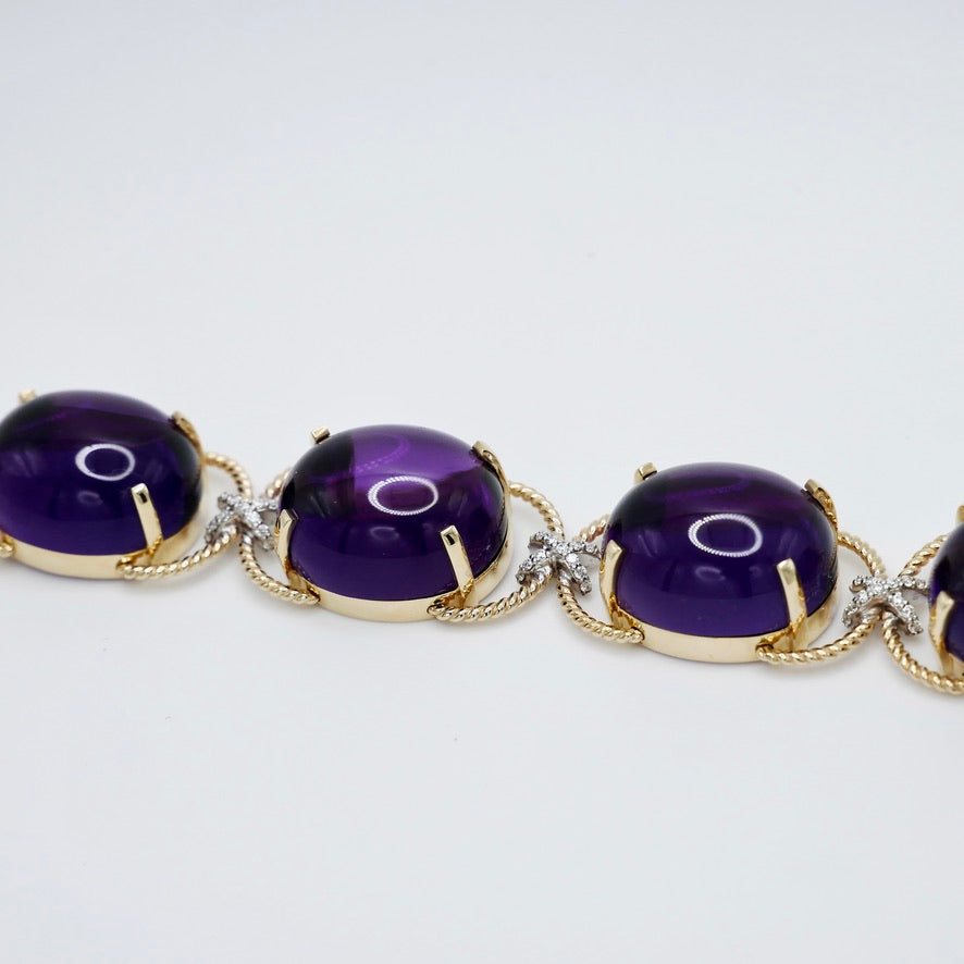 Introducing our Sicilian Amethyst Cabochon Bracelet, a blend of history and elegance. The heart of this bracelet holds cabochon moonstones, a classic shape cherished for centuries. These stones have a rich history as they were treasured by ancient civilizations. The gold design is inspired by Sicilian ropes, adding a touch of the island's heritage. Verdura Pebble Cabochon Sicily Bracelet