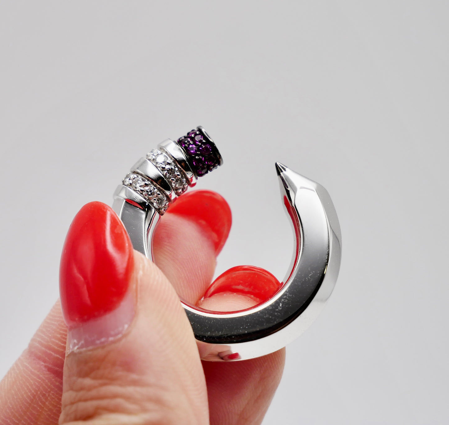 This 6mm platinum ring is designed to resemble a pencil wrapped around your finger. One end features a tapered point mimicking a pencil tip, while the opposite end showcases alternating bands of pavé-set baguette moissanites and pink lab rubies that recreate the classic eraser and ferrule design. Crafted in solid platinum with an open-band construction, this whimsical piece combines playful design with luxury materials. An ideal conversation starter for writers, artists, teachers, or anyone who appreciates unique jewelry with a creative twist.