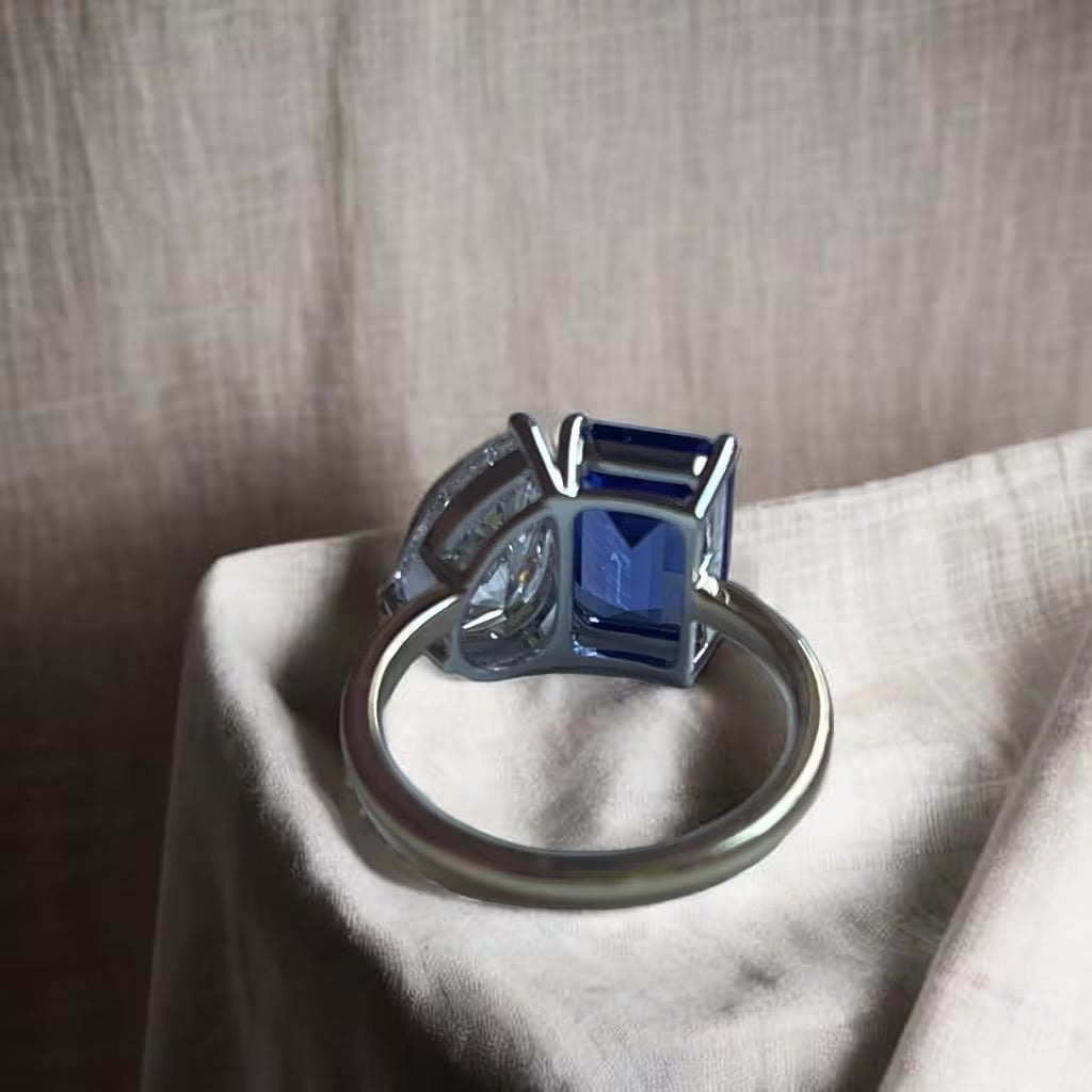 Elegance and sophistication converge in our exquisite Moi et Toi ring, a symbol of timeless love and unity. This masterpiece showcases a stunning 2.3 carat lab-grown pear diamond and a 3 carat emerald-cut lab-grown sapphire, delicately cradled in an 18k white gold tiger prong setting, while the contrasting yellow gold band adds a touch of warmth and uniqueness. The brilliance of the D or E color and VS clarity lab-grown diamonds enhances the allure of this ring, ensuring it will captivate hearts for generations to come. To make it truly yours, we offer free engraving, allowing you to add a personal touch to this extraordinary piece of jewelry. Embrace the future of fine jewelry with this eco-friendly, stunning creation that reflects both love and ethical responsibility.