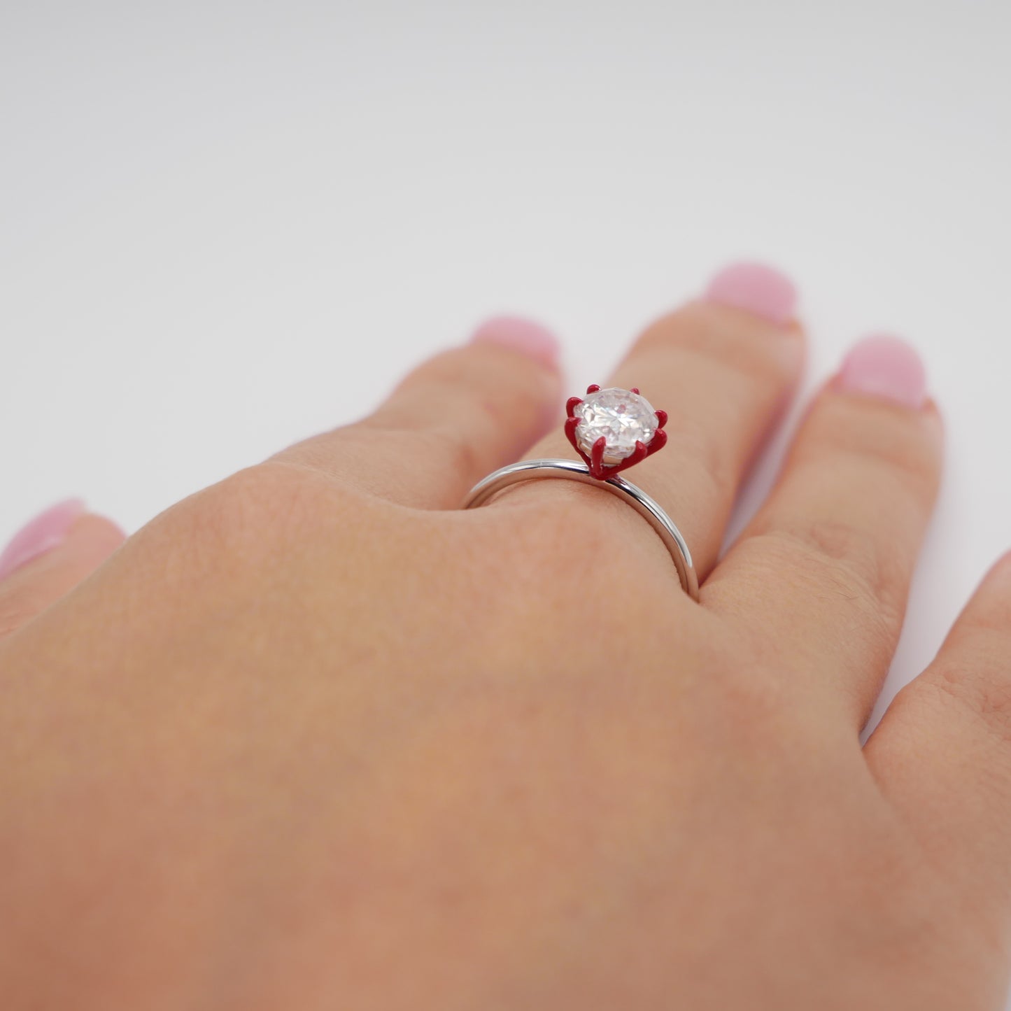 Discover the playful contrast of our 1.5 ct oval moissanite ring, where classic elegance meets whimsical charm. Set in 14K white gold, this ring features uniquely striking red enameled claw prongs that pop against the brilliant moissanite center. The delightful interplay of red and white gold enhances the stone's sparkle, crafting a look that's both eye-catching and chic. Perfect for those who love a touch of the unexpected, this ring promises to be a conversation starter at any occasion.