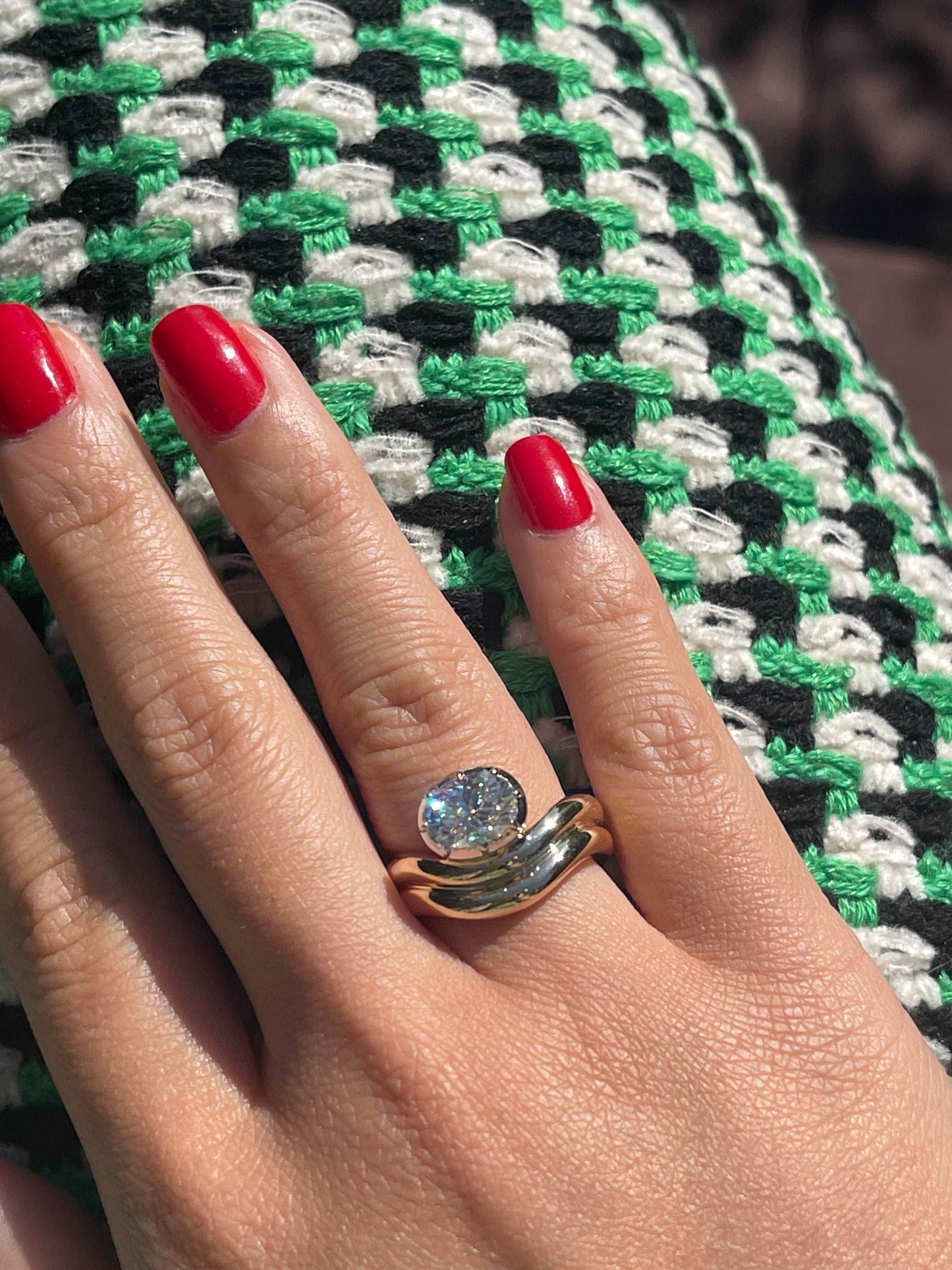 Our oval Sculptural Moissanite Ring features an exquisite 1.7 carat oval diamond, elegantly cradled in a Georgian cut-down setting. Meticulously handcrafted in the fusion of 14K white and 14K yellow gold, its two gracefully curved bands intertwine to create a captivating, wavy-line design.