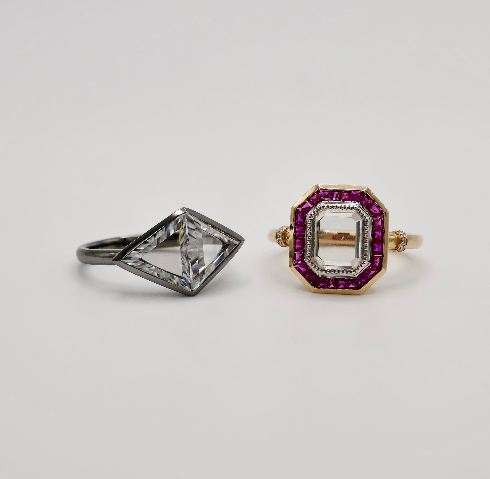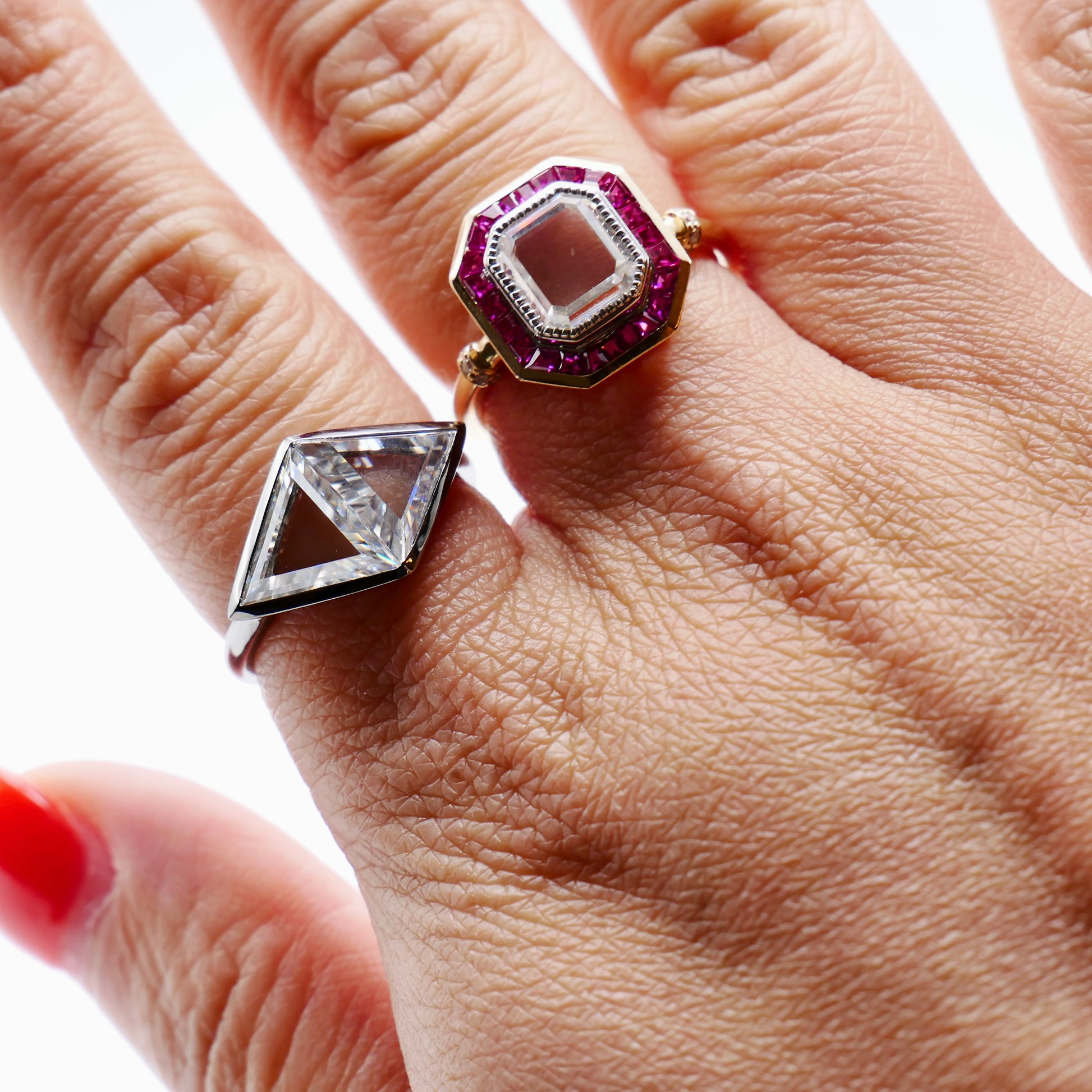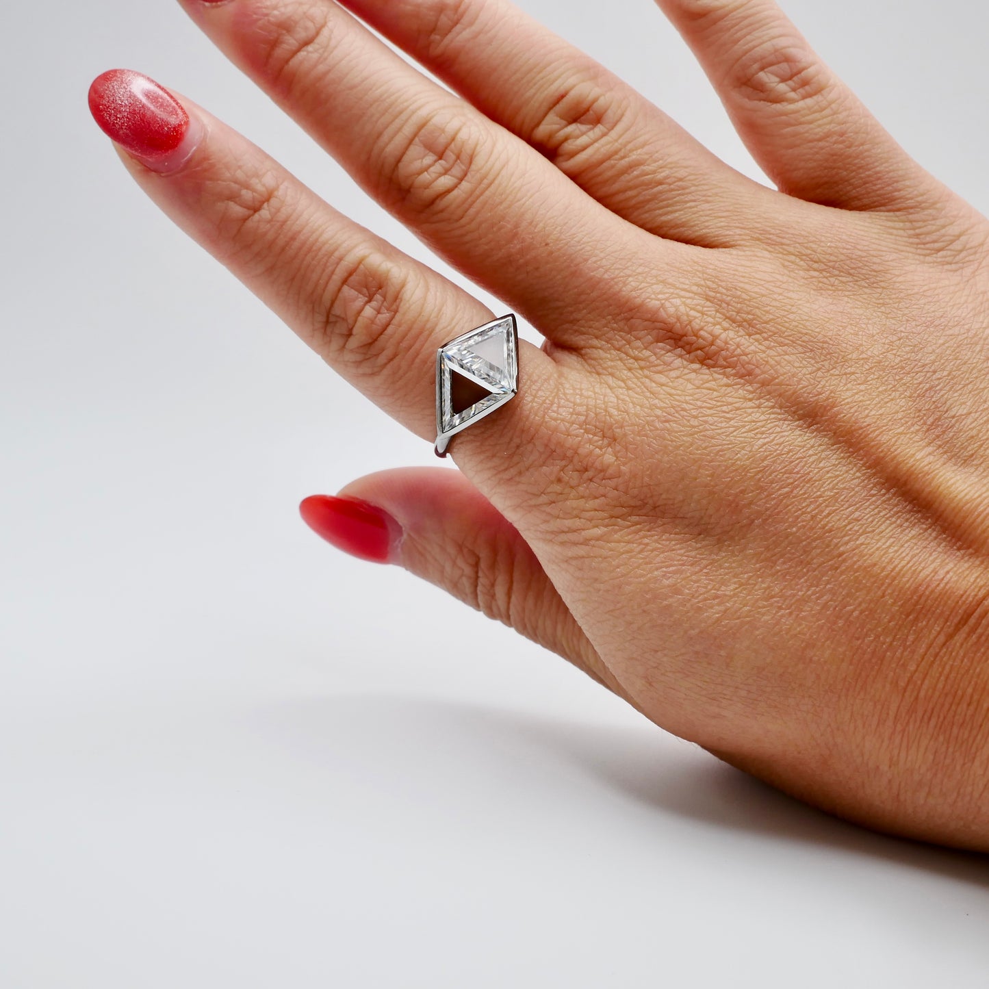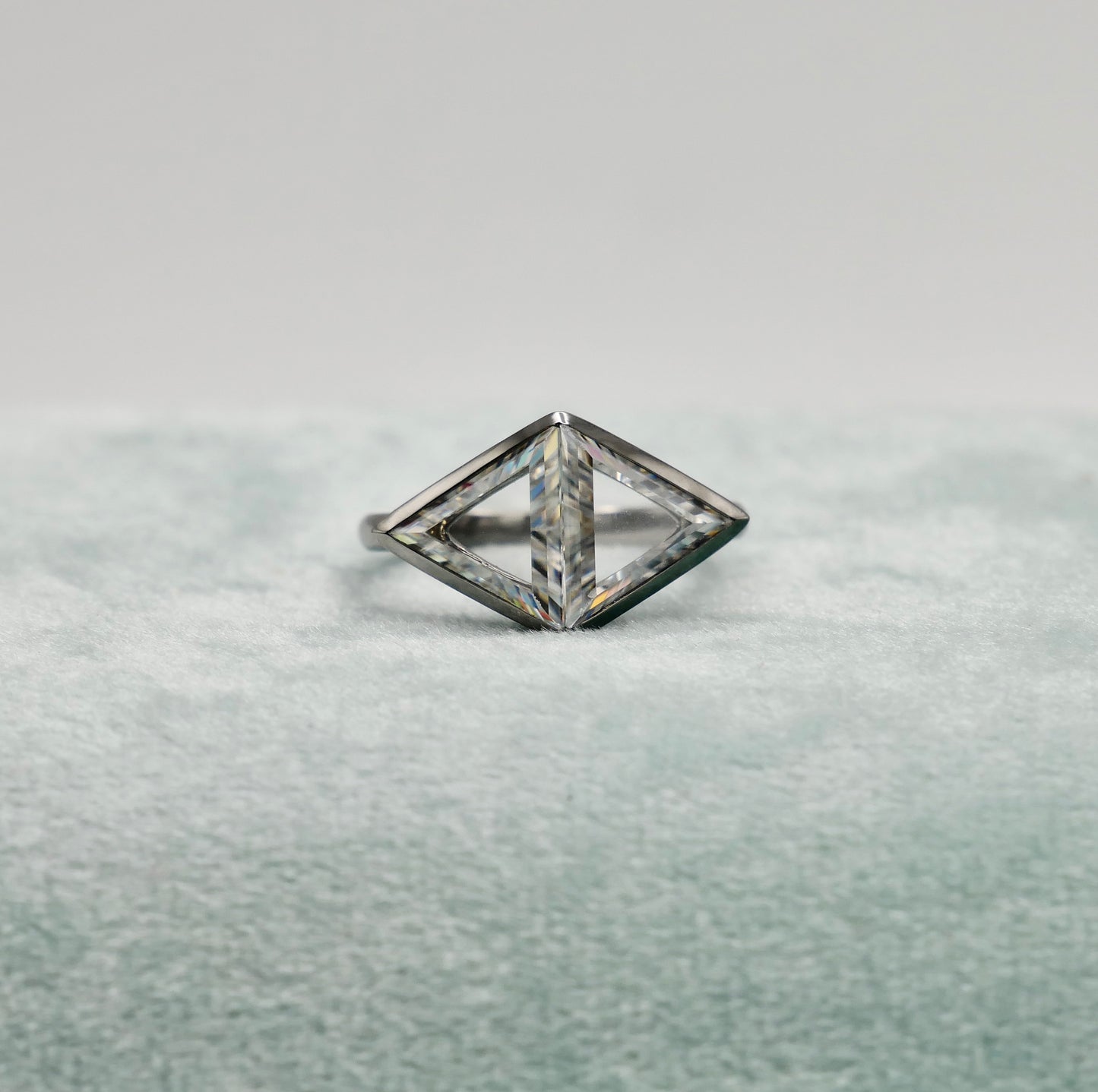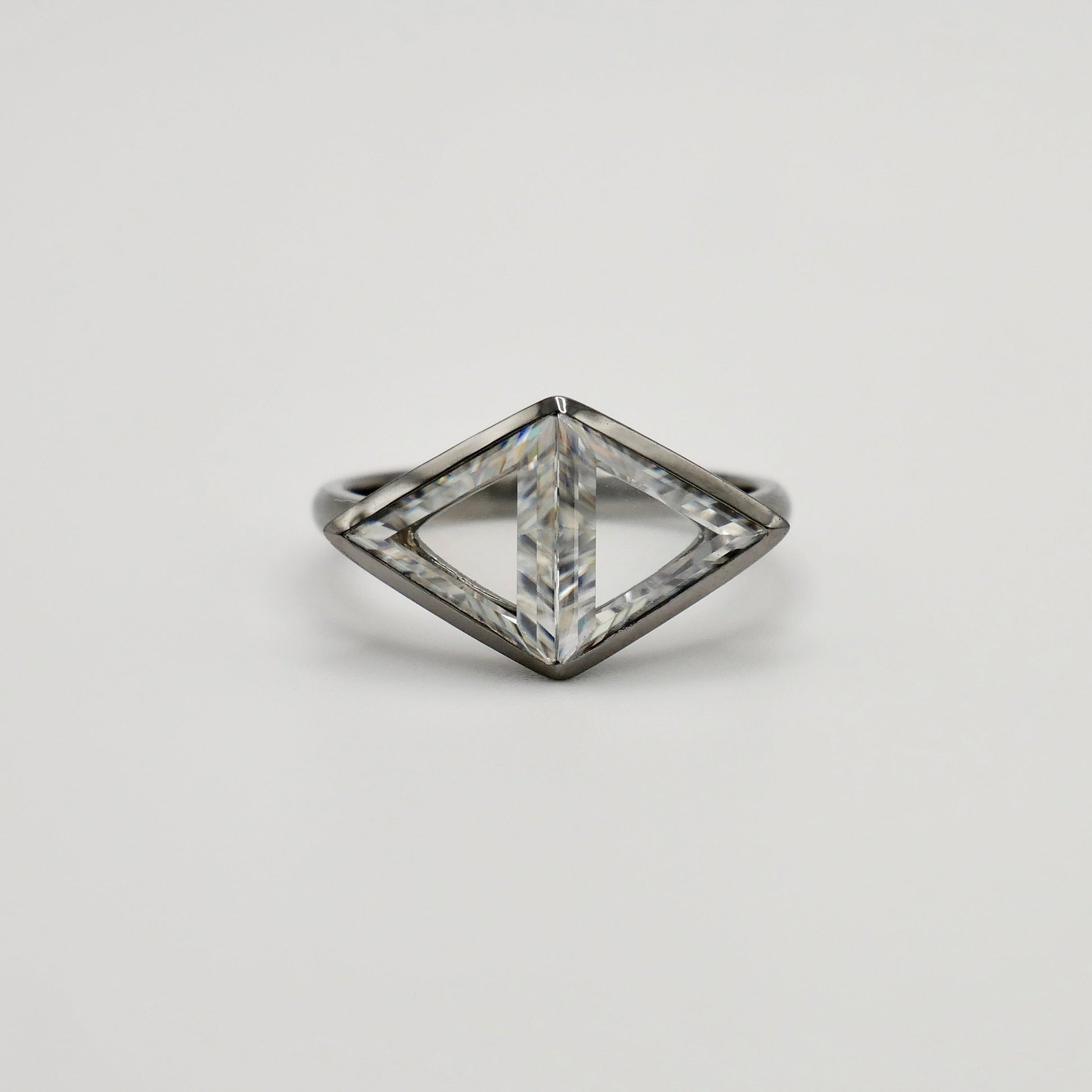 This striking 14K blackened gold ring features two exceptional 3-carat triangle cut portrait moissanites for a total of 6 carats of brilliant sparkle. The geometric triangle cuts create a bold, modern aesthetic that captures and reflects light beautifully from every angle. Set in dramatic blackened gold, the clear moissanites create a stunning contrast that emphasizes their crystal clarity and fire. The sleek bezel setting securely holds each stone while maintaining the ring's contemporary, architectural appeal. This statement piece combines substantial carat weight with cutting-edge design for those who appreciate distinctive luxury jewelry. Fearber ring