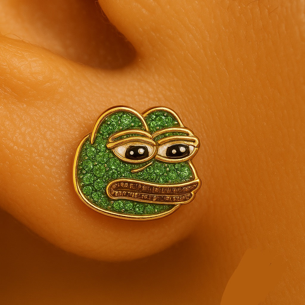Add a whimsical touch to your jewelry collection with our charming Pepe Frog stud earrings. Crafted in your choice of 14K or 18K gold, these delightful studs sparkle with an intricate setting of brilliant moissanites and measure 10 x 10 mm, capturing Pepe's iconic expression in exquisite detail. Perfect for adding a playful yet luxurious element to any outfit, these earrings are sure to bring a smile and a sparkle wherever they go. Ideal for both casual and formal wear, these Pepe Frog earrings are a fun, unique accessory for those who love to infuse a bit of joy and humor into their style.