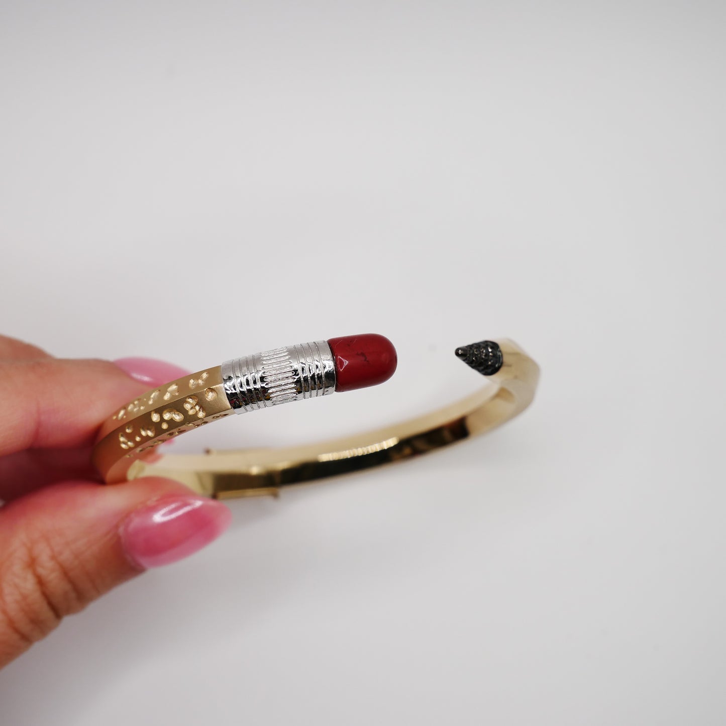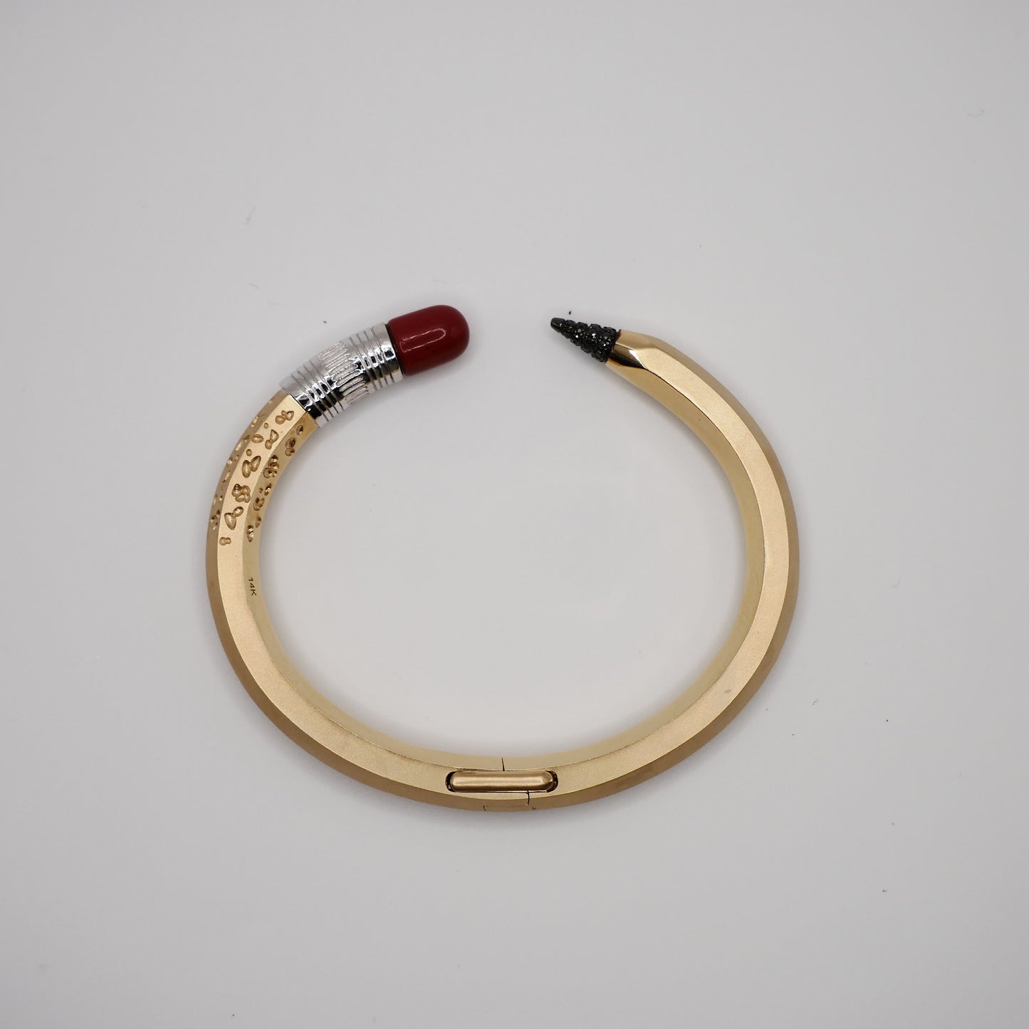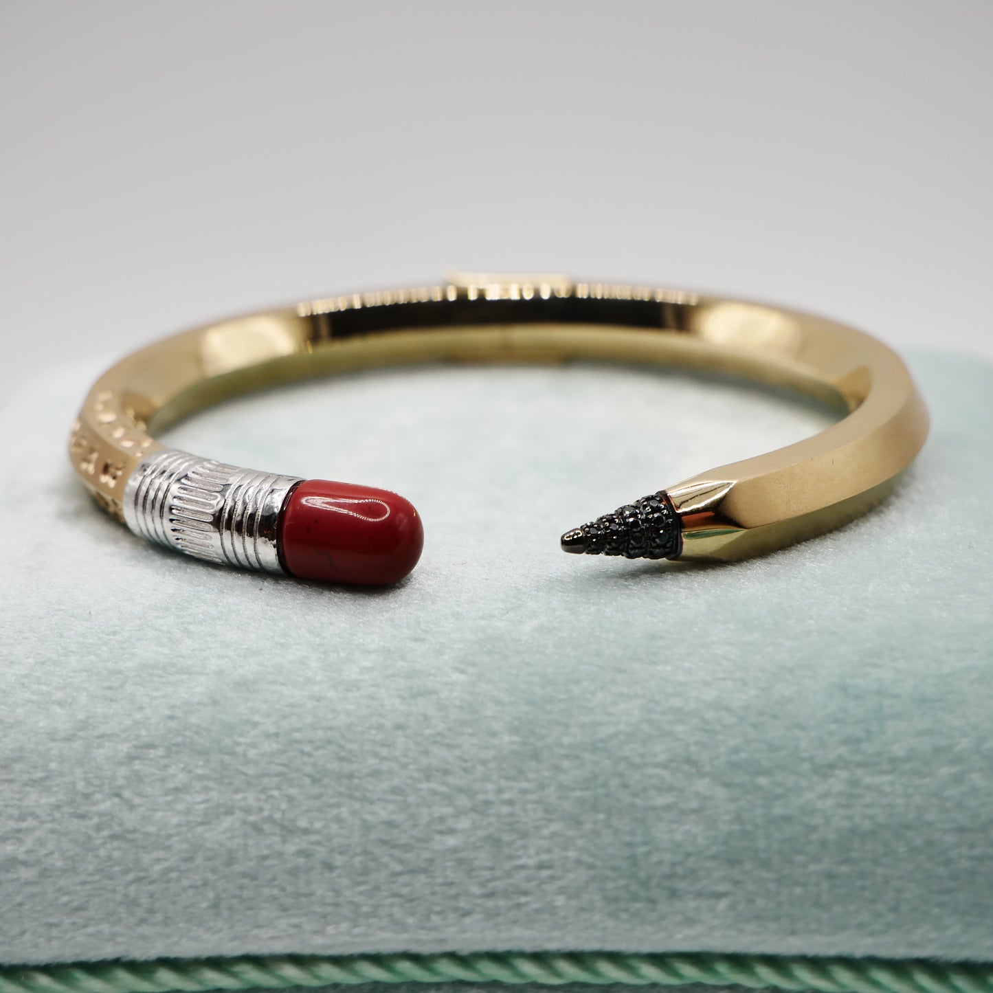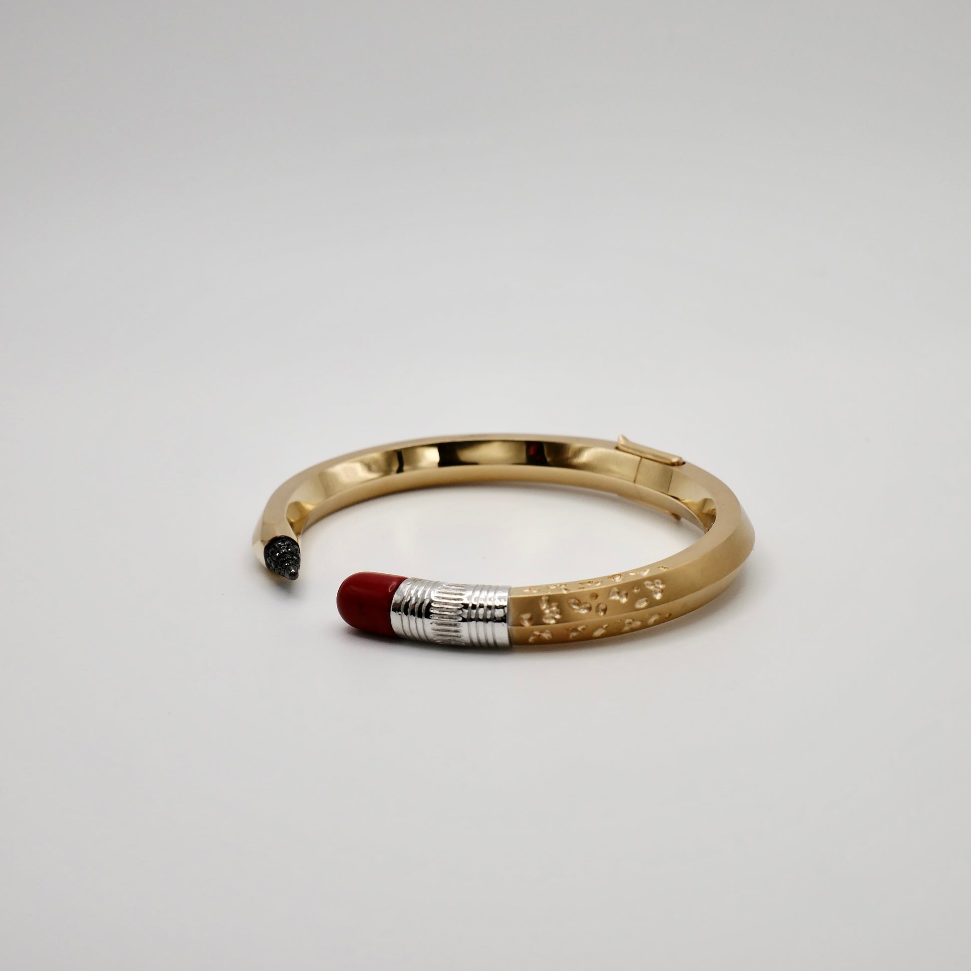 This charming pencil bracelet is a delightful tribute to creativity. The clever design features sparkling white baguette moissanites and contrasting black moissanites that beautifully recreate the classic pencil look, topped with a jasper stone and with bite marks. The hinged bracelet opens smoothly for easy wear, combining the luxurious warmth of gold-filled metal with the brilliant sparkle of premium moissanites. Whether you're treating yourself or searching for an unforgettable gift, this whimsical piece celebrates the power of words and creativity in the most stylish way. It's guaranteed to spark conversations and bring a smile to anyone who appreciates the perfect blend of playfulness and elegance. Nadine Ghosn Pencil Bracelet Bangle