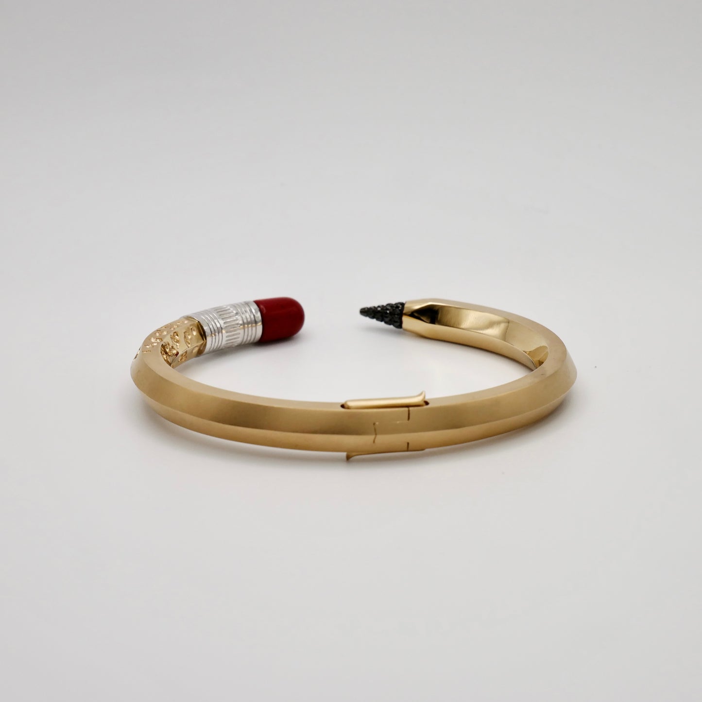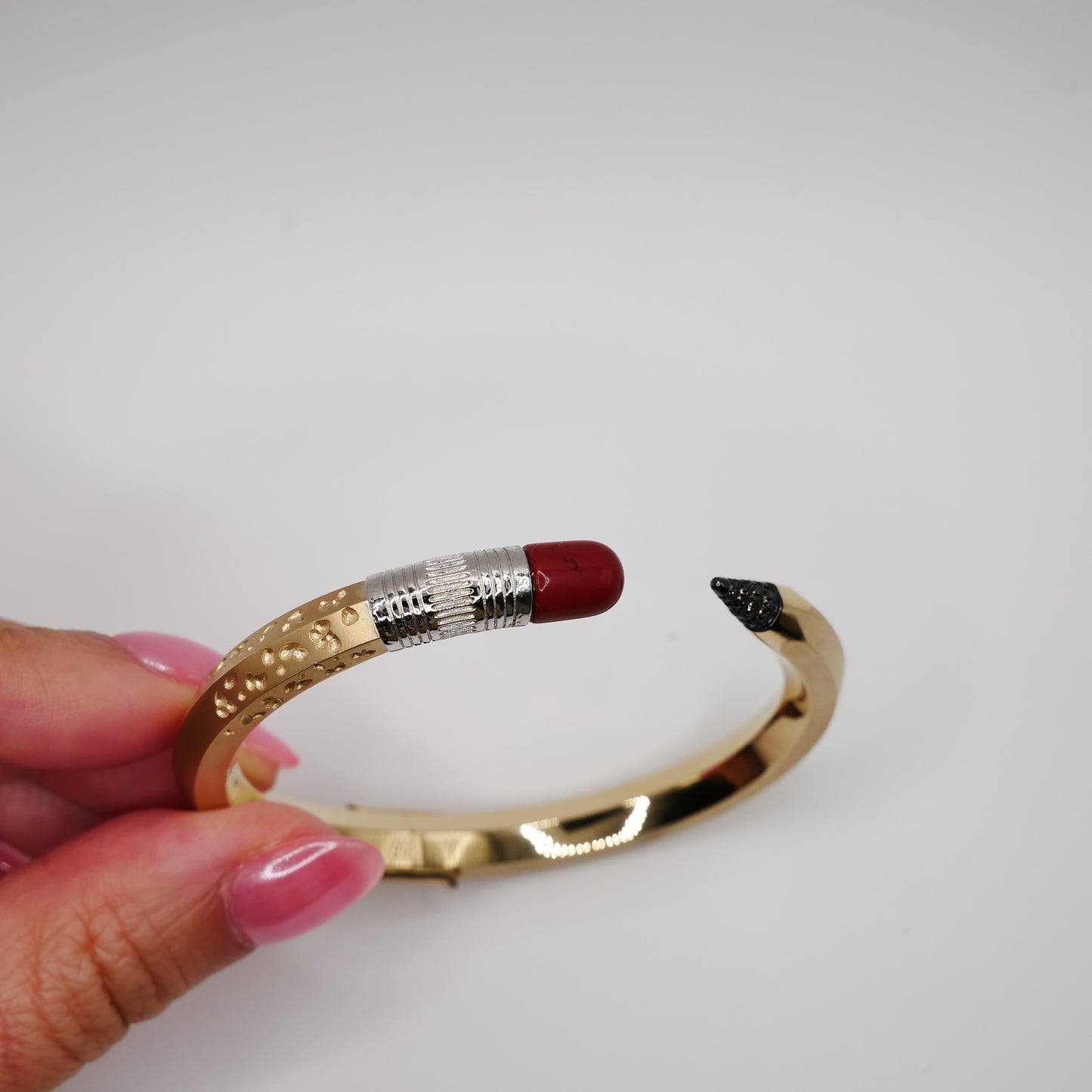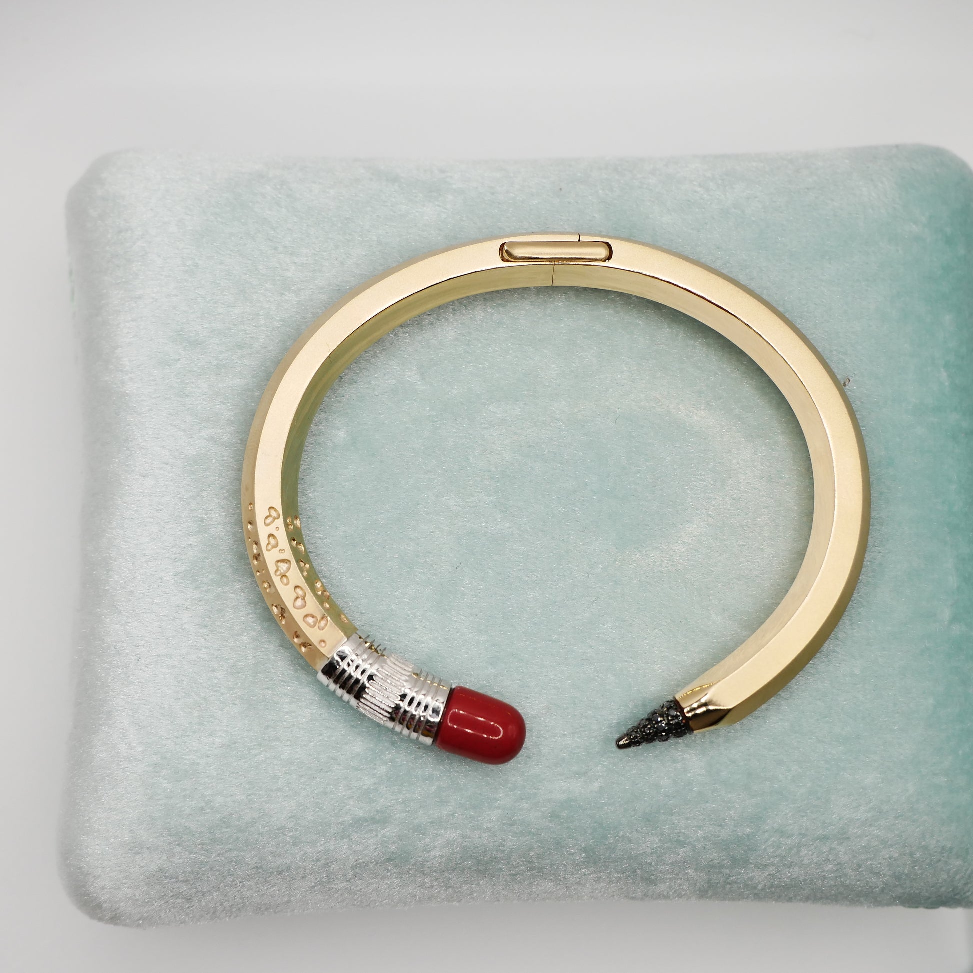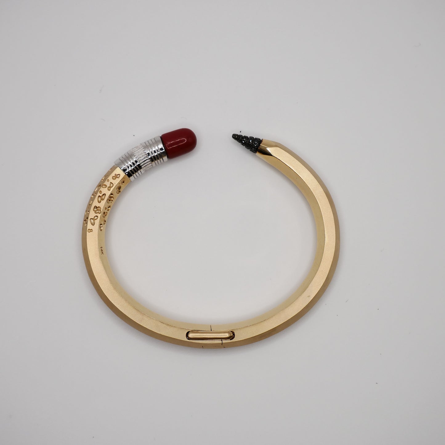 This charming pencil bracelet is a delightful tribute to creativity. The clever design features sparkling white baguette moissanites and contrasting black moissanites that beautifully recreate the classic pencil look, topped with a jasper stone and with bite marks. The hinged bracelet opens smoothly for easy wear, combining the luxurious warmth of gold-filled metal with the brilliant sparkle of premium moissanites. Whether you're treating yourself or searching for an unforgettable gift, this whimsical piece celebrates the power of words and creativity in the most stylish way. It's guaranteed to spark conversations and bring a smile to anyone who appreciates the perfect blend of playfulness and elegance. Nadine Ghosn Pencil Bracelet Bangle