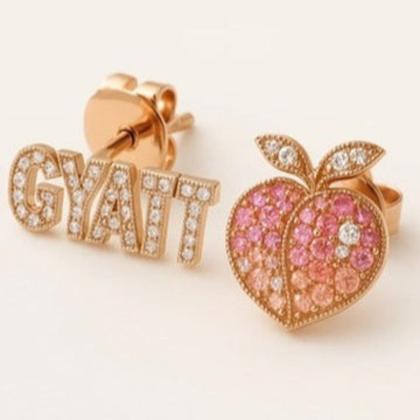 Our charming 14K rose gold mismatched earrings features one earring spelling out "Gyatt" in a whimsical script, while its delightful counterpart showcases a meticulously crafted peach, both adorned with a sparkling arrangement of white, light pink, and light orange moissanites. Crafted in lustrous 14K rose gold, these earrings are perfect for adding a touch of whimsy to both everyday and special occasion outfits. Whether you're looking to express your quirky side or give a gift that stands out from the crowd, these earrings are sure to capture hearts with their originality and vibrant sparkle. Embrace your unique style with this exquisite pair that promises to be a conversation starter.