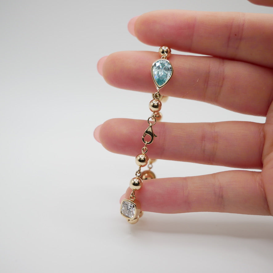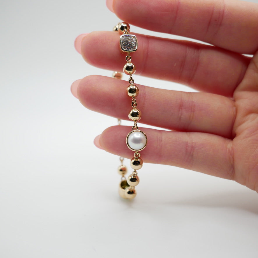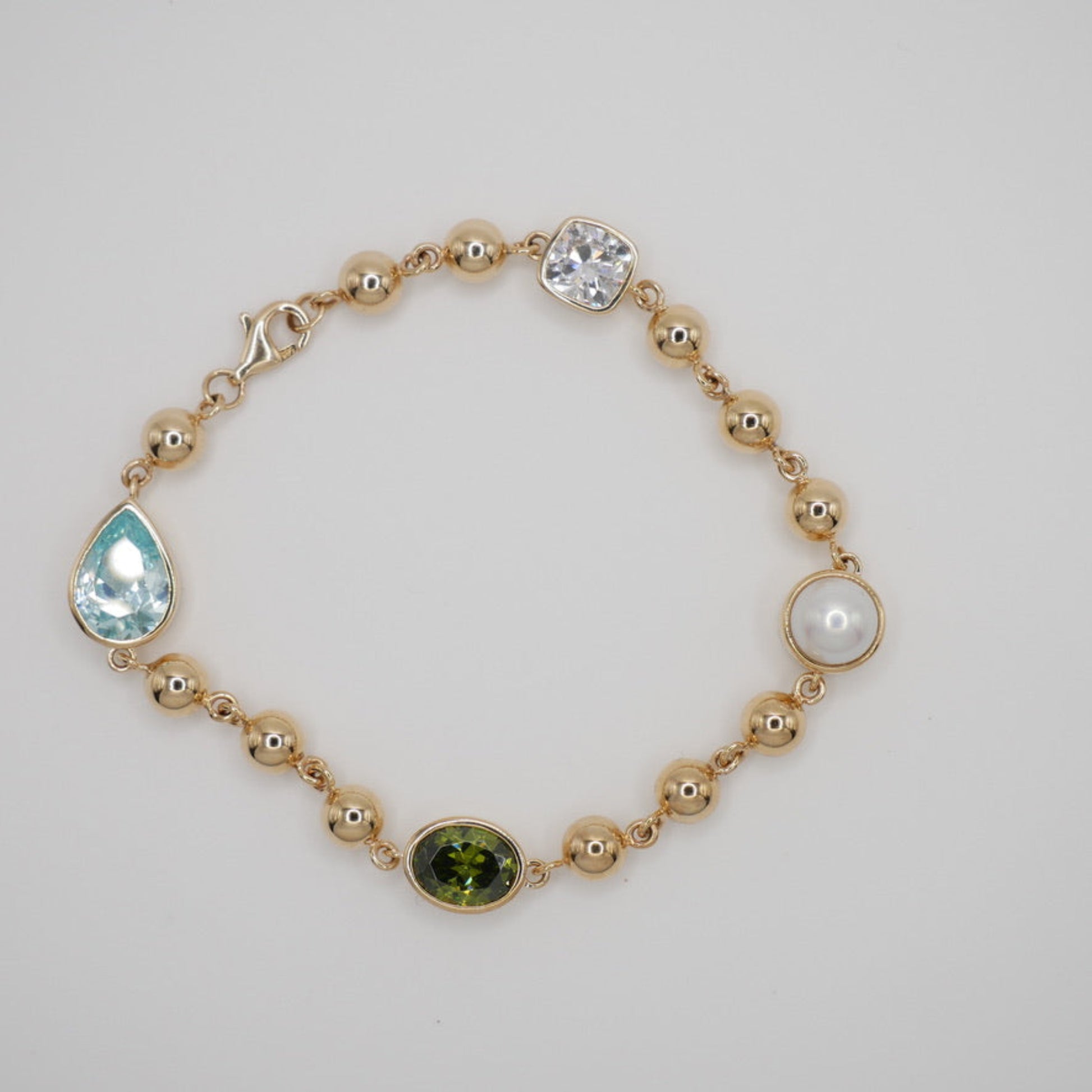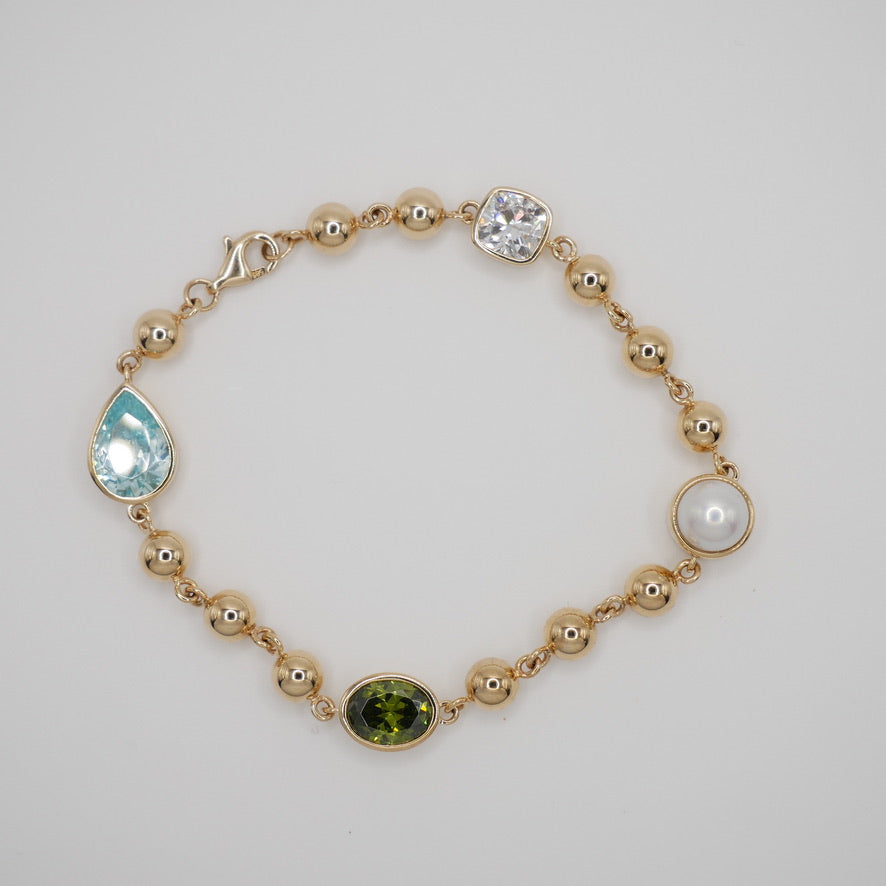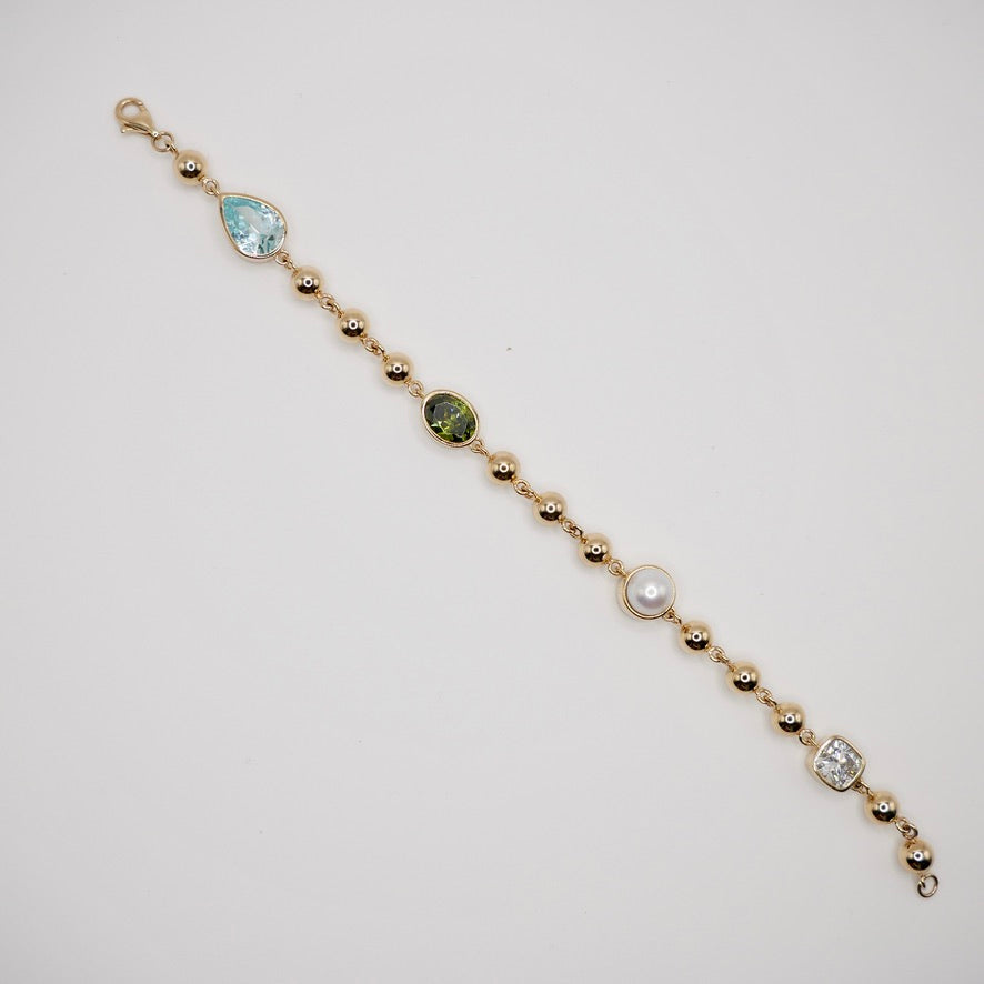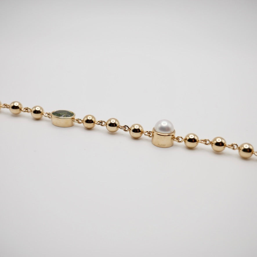 This elegant bracelet combines classic gold ball chain design with a curated selection of precious lab grown gemstones. The 5mm, 14K polished gold balls create a rhythmic pattern, punctuated by four distinctive stones: a lustrous pearl, brilliant cushion-cut diamond, vibrant oval peridot, and serene pear-shaped aquamarine. Each gemstone is bezel-set to highlight its unique character while maintaining the bracelet's fluid movement. The varying shapes and colors of the stones create visual interest against the uniform gold spheres, making this piece both timeless and contemporary. Secured with a sturdy lobster clasp, this bracelet offers versatility for both everyday elegance and special occasions.