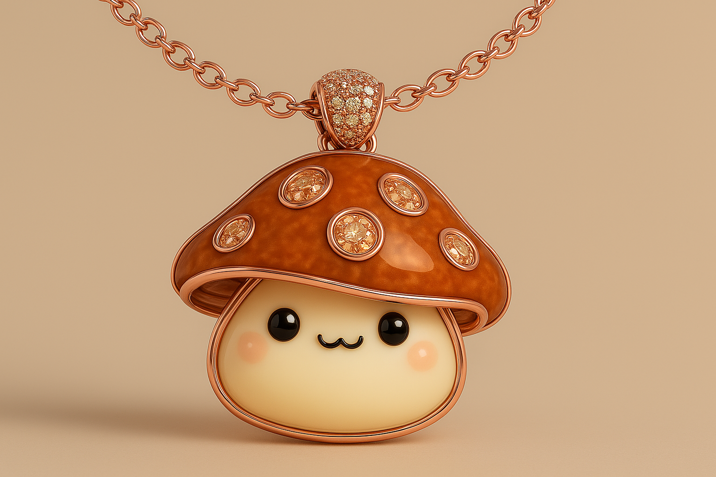 Capture the charm and whimsy of your favorite fantasy world with this enchanting mushroom pendant. Expertly crafted in 14K gold, this delightful piece features a dome-shaped body made from polished cream-colored opal, with subtle rose quartz accents adding a blush to the cheekbones. The vibrant orange amber cap sparkles with inlaid yellow, white or rose colored moissanite spots, creating a dazzling display of color and light. Measuring 25 x 25 mm, this pendant brings a touch of magical mystery to any outfit, perfect for those who love their jewelry with a playful twist. Embrace a unique and adorable look with this enchanting mushroom pendant, sure to enchant and delight at every glance.