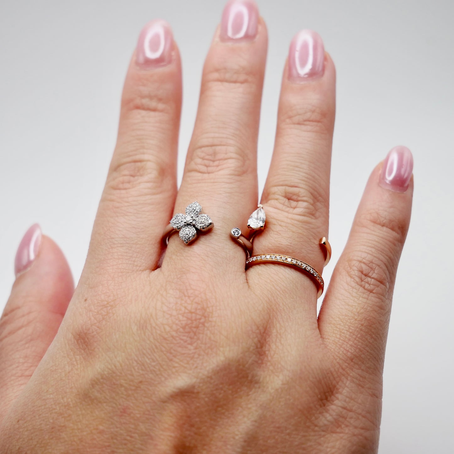 A 0.64 carat lab grown diamond clover ring set in 18K white gold. Available in 18 yellow gold, white gold and rose gold (3 weeks to customize). Diamond Clover Ring as seen on Amelia Liana - Yael Joaillerie