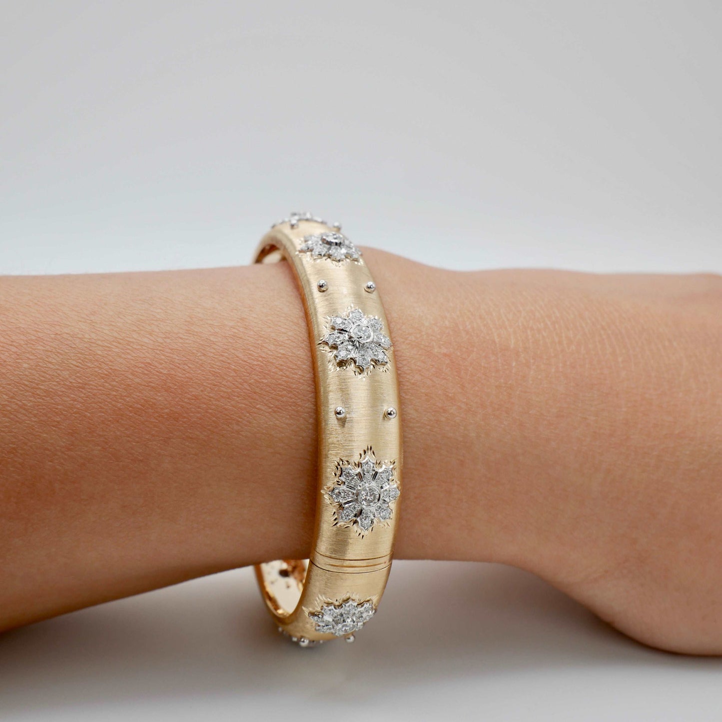 Indulge in the luxurious allure of our 18k Engraved Gold Silk-Inspired Bangle, a masterpiece of craftsmanship and elegance. With a generous width of 10mm, this bracelet captivates with intricate engravings that artfully mimic the soft folds of silk fabric, adding a touch of timeless sophistication to your ensemble. Adorned with delicate diamond flower inlays, each petal sparkles with brilliance, creating a harmonious blend of opulence and nature-inspired beauty. White gold studs accentuate the design, contributing a contemporary edge to this exquisite piece. Buccellati Macri Yellow Diamond Bracelet Bangle