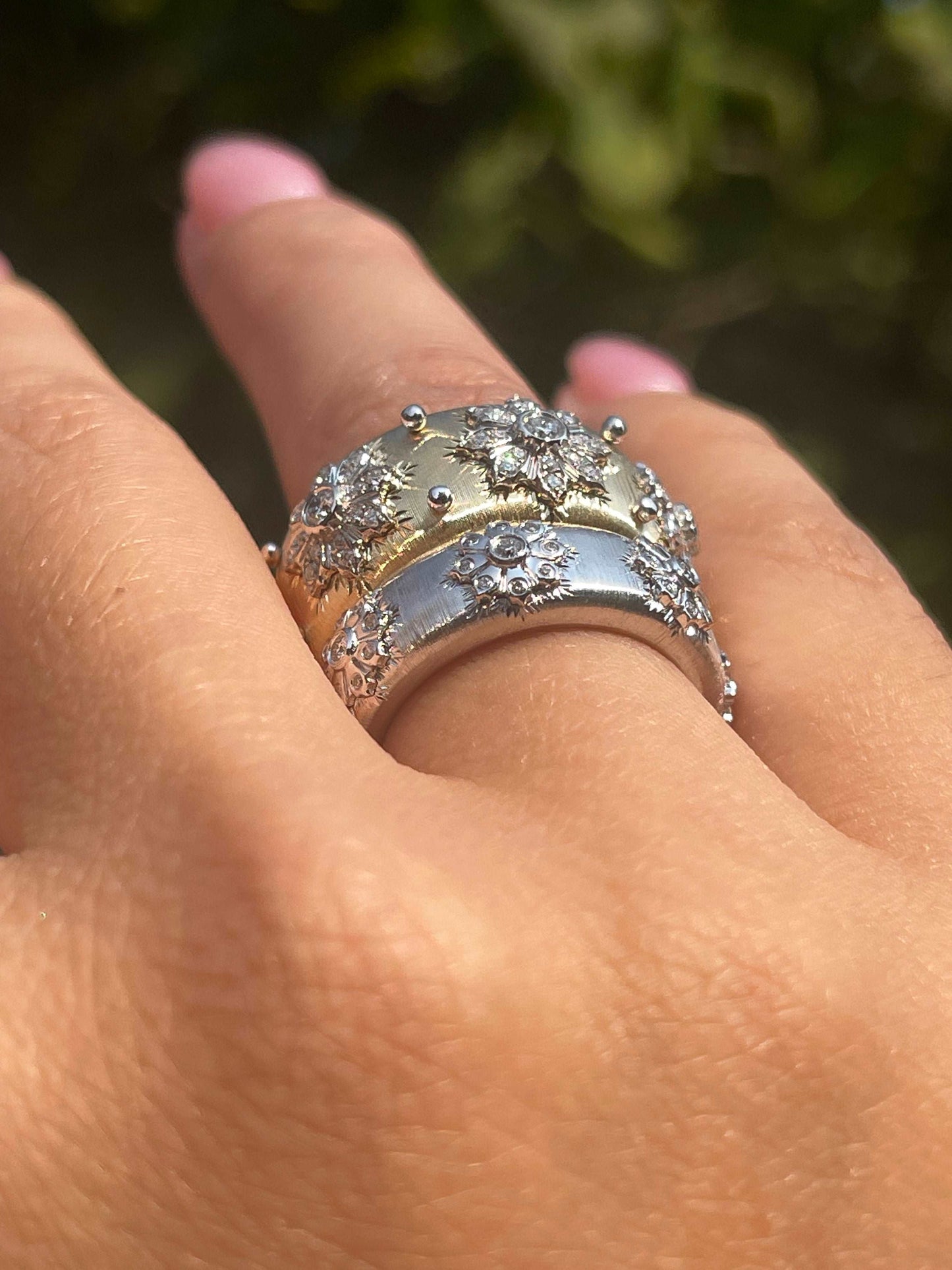 Indulge in the luxurious allure of our 18k Engraved Gold Silk-Inspired Ring, a masterpiece of craftsmanship and elegance. With a width of 4mm, this ring captivates with intricate engravings that artfully mimic the soft folds of silk fabric, adding a touch of timeless sophistication to your ensemble. Adorned with a delicate diamond flower inlay, each petal sparkles with brilliance, creating a harmonious blend of opulence and nature-inspired beauty. White gold studs accentuate the design, contributing a contemporary edge to this exquisite piece. Buccellati Macri White Diamond Ring