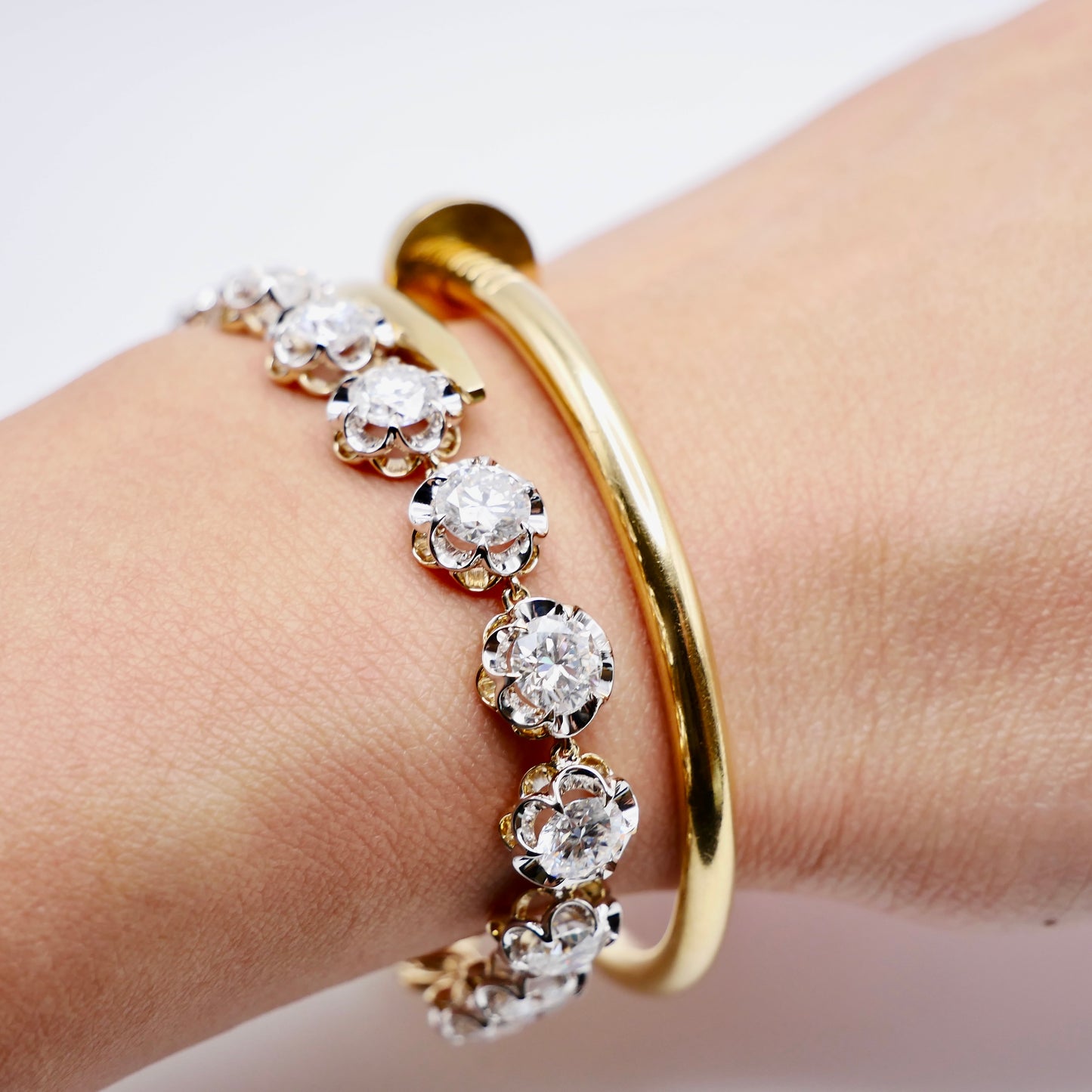 Elevate your wrist with our exquisite dual-tone tennis bracelet. Featuring 10-15 carats of flawlessly cut moissanites, the stones are masterfully set in an elegant scalloped design that alternates between 18K white and yellow gold, creating a sophisticated two-tone effect that complements any jewelry collection. What truly sets this bracelet apart is the delicate flower motif meticulously crafted into the back of each scalloped edge—a hidden detail that reveals itself only to the wearer, adding a personal touch of luxury.