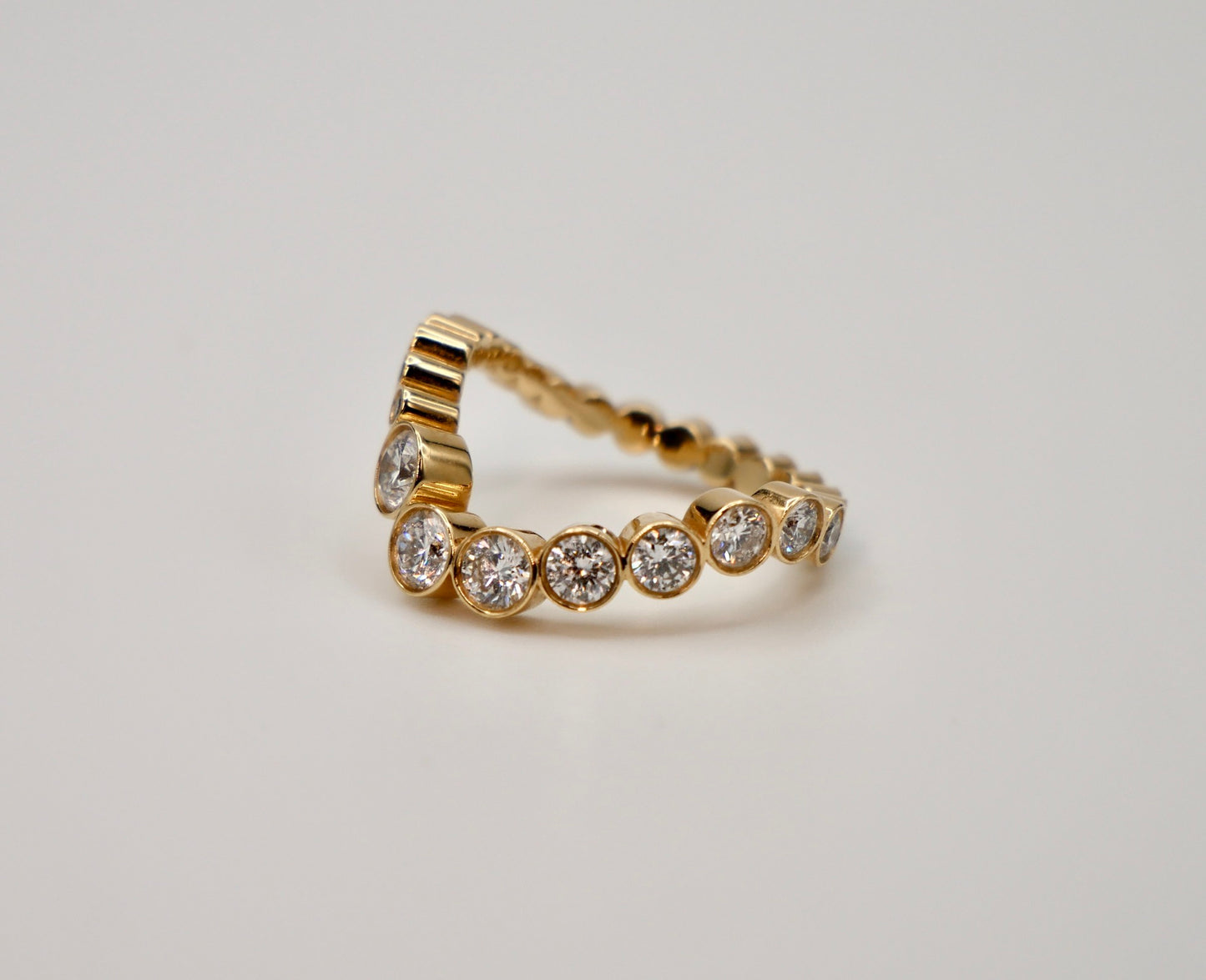 This exquisite ring elegantly mirrors the rhythmic dance of waves, with its intricate design and shimmering gemstones capturing the essence of the sea's allure. This ring features a row of lab diamonds or moissanites that curve around the finger. Total carat weight of 1.4 cts. Sophie Bille Brahe Ensemble Diamond Ring