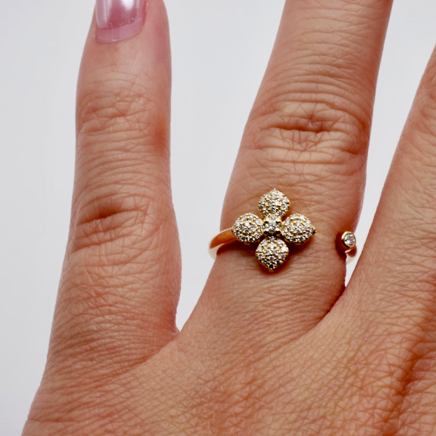 A 0.64 carat lab grown diamond clover ring set in 18K yellow gold. Available in 18 yellow gold, white gold and rose gold (3 weeks to customize). Diamond Clover Ring as seen on Amelia Liana - Yael Joaillerie
