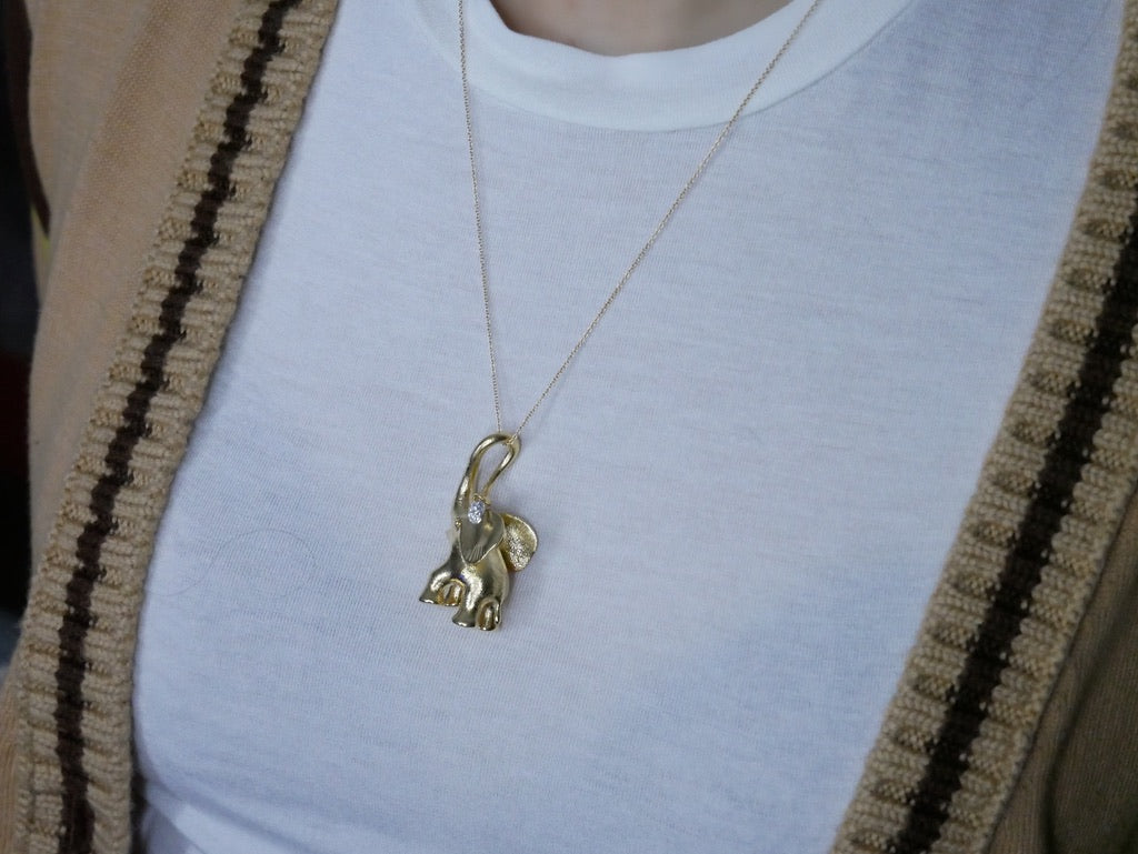 This majestic large elephant pendant stands at 41 mm in height and crafted from luxurious 18 karat yellow gold. This delightful piece is adorned with 24 pave-set diamonds, totaling an impressive 0.11 CTs, adding a touch of sparkle and whimsy. The playful combination of hammered and polished surfaces gives this pendant its distinctive texture, making it a truly one-of-a-kind statement piece.