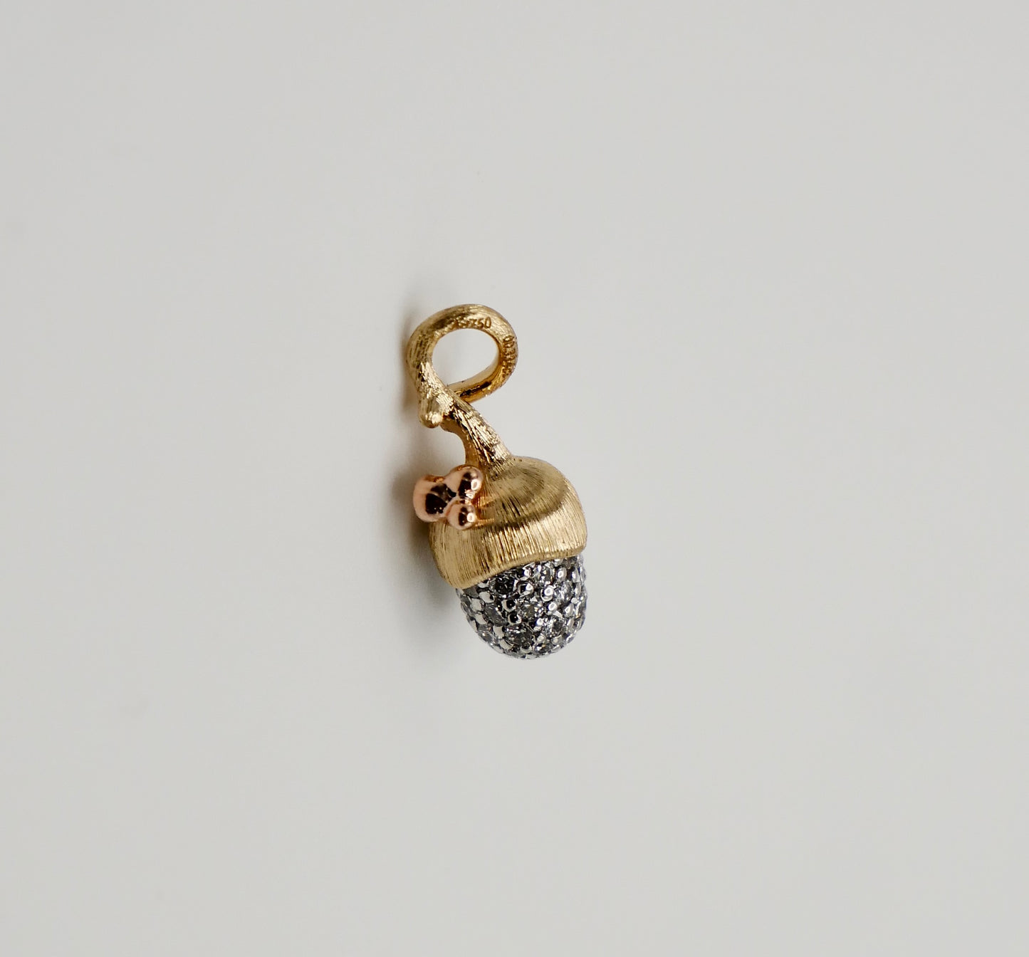This beautiful acorn/pinecone pendant stands at 15 or 18 mm in height and is made from 18 karat yellow and white gold. This charming piece features approximately 0.4 cts of natural pave diamonds. It's versatile enough to be worn as a pendant on a necklace or bracelet. Ole Lynggaard Acorn Pendant